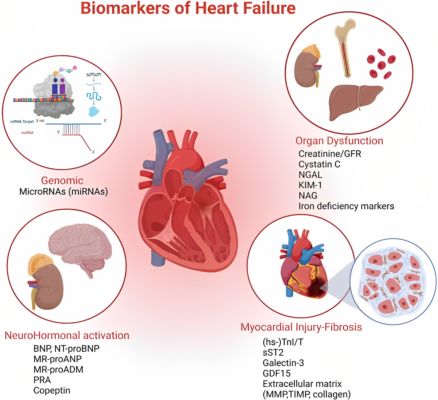 Although the prevalence and incidence of heart failure (HF) differ in different countries, depending on differences in study designs, it remains a disease with high prevalence and mortality [1]. The real prevalence of the disease is underestimated and increases with age [2]. Moreover, considering the general demographic data, it can be considered increasing in all Western countries where it continues to represent the leading cause of hospitalization and, despite the treatments we have and the apparent reduction in the number of hospital admissions, the rehospitalization rate remains high [3]. In fact, in developed countries, the age-corrected incidence may seem to be decreasing, an expression of increasingly effective management but the aging of the population accounts for its overall increase [4]. As derived from the data of the Italian National Outcomes Program, prior to the introduction of SGLT2 and 1 inhibitors (sodium-glucose- cotransporter 2 and 1 inhibitors), no therapeutic agent had been demonstrated in recent years to significantly reduce one-month rehospitalization rates and 1- and 5-year mortality rates. Considering the pathophysiological assumptions and results achieved by recent studies, it is reasonable to think of a further improvement in the prospects of care and the performance status of these patients [5, 6]. A better knowledge of the alterations of the neuro-hormonal and cytokine balance underlying its genesis and maintenance could contribute significantly to this. It is, therefore, desirable to identify biomarkers that can allow a practical clinical approach to identify subjects most at risk deserving of closer follow-up and possible optimization of therapies. Intravenous iron infusion also reduced the composite risk of first hospitalization and recurrent hospitalizations for HF, although with no effect on mortality [7]. Therefore, even the biomarkers of the iron metabolism could represent, indirectly, an index of evaluation of the state of the patient suffering from HF. It could also be useful to understand the role of individual biomarkers in the different categories of HF (heart failure with mildly reduced ejection fraction (HFmrEF), heart failure with preserved ejection fraction (HFpEF), heart failure with reduced ejection fraction (HFrEF)) and to investigate the biohumoral modifications that will follow the achievement of new metabolic and neurohumoral balances with the use of new drugs. Cardiac markers analyzed in this review range from having both diagnostic and prognostic capabilities but are increasingly being studied as therapeutic targets in order to impact the evolution of the disease itself.