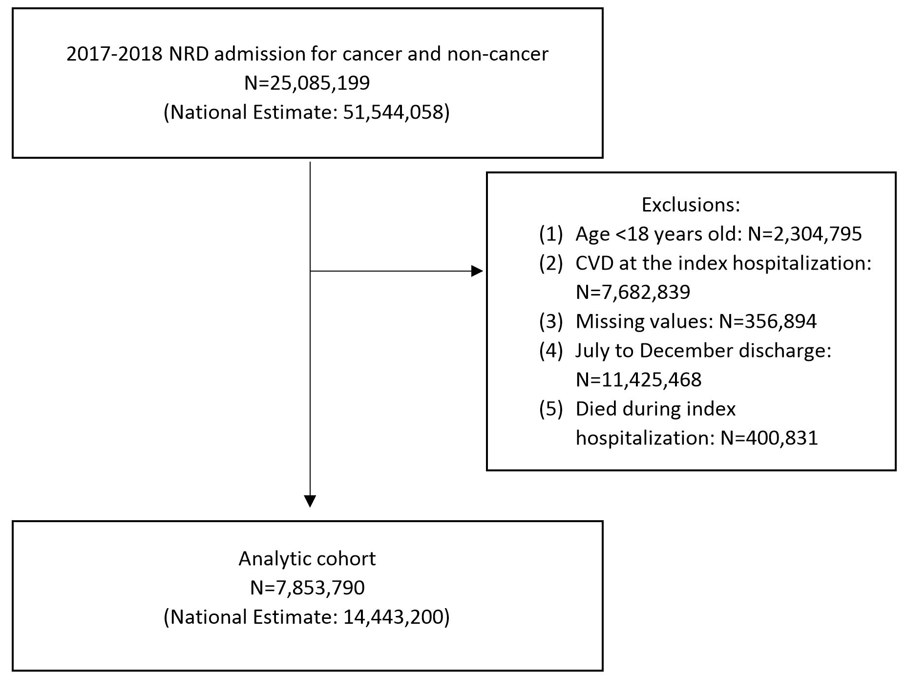 Fig. 1.Diagram flow of the study selection before propensity score matching. CVD, cardiovascular disease; NRD, Nationwide Readmissions Database.