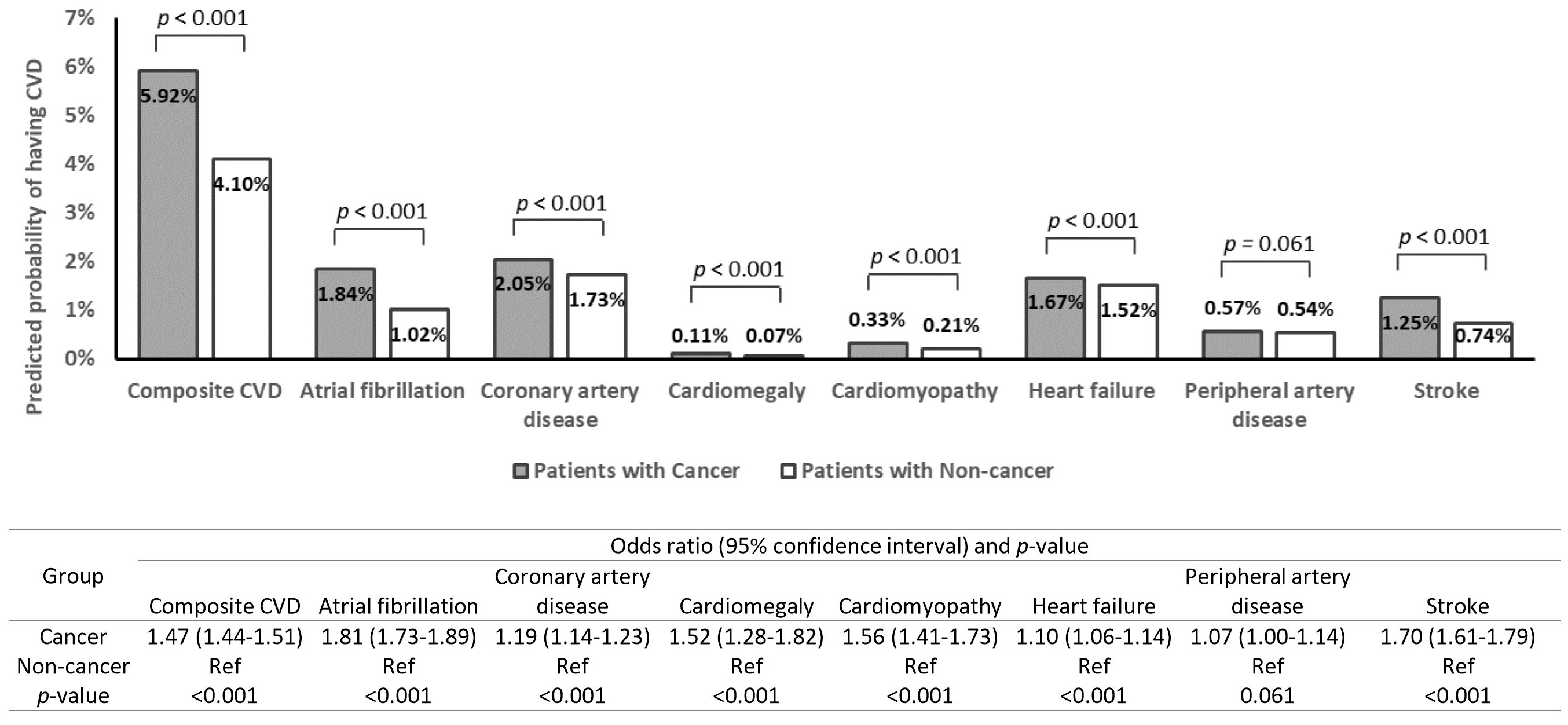 the proportion of patients with and without cancer who had a CVD readmission. We