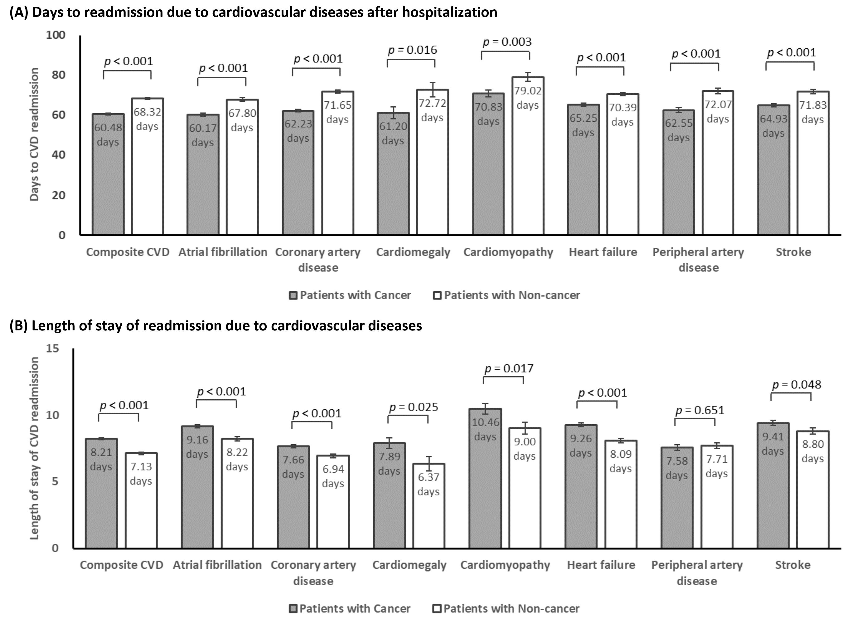 In this large population-based study of 600,796 patients with and without cancer, we found that patients hospitalized with cancer experienced a significantly higher risk of CVD readmission. In addition, patients with cancer tended to have CVD readmissions that occurred sooner and required longer hospital stays compared to patients without cancer, and these trends were identified across all individual CVD types (i.e., atrial fibrillation, coronary artery disease, cardiomegaly, cardiomyopathy, heart failure, peripheral artery disease, and stroke). These results suggest that efforts to reduce unplanned readmissions due to CVD by, for example, providing optimized chronic care and post-discharge care may be needed for patients with cancer.