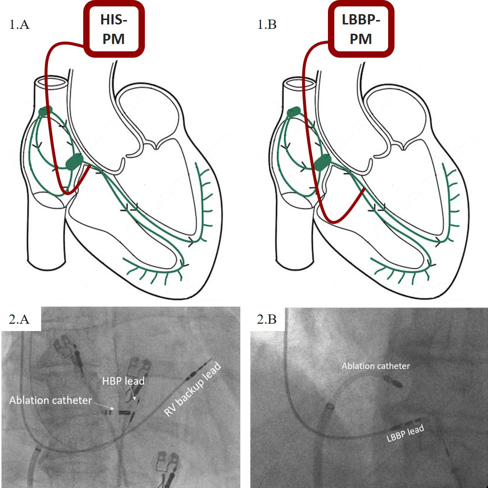 Fig. 1.Schematic representation of pacemaker (PM) lead positions (1) and their relation to the ablation catheter under fluoroscopy (2). (A) His bundle pacing (HBP). (B) Left bundle branch pacing (LBBP). For clarity, the backup pacing lead is not illustrated.