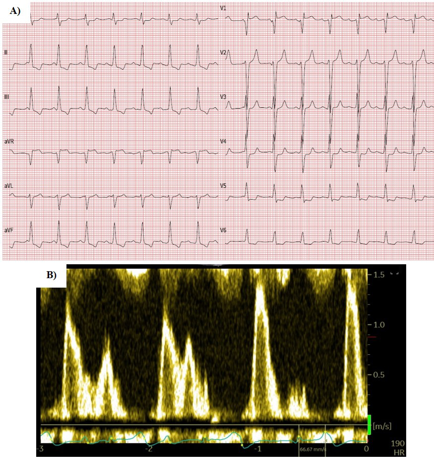 Fig. 3.12-lead ECG (A) and mitral inflow pattern (B) of the patient who converted to sinus rhythm after left bundle branch pacing and atrioventricular node ablation. Note the VVI pacing mode and atrioventricular dissociation due to the lack of atrial lead. ECG, electrocardiogram.
