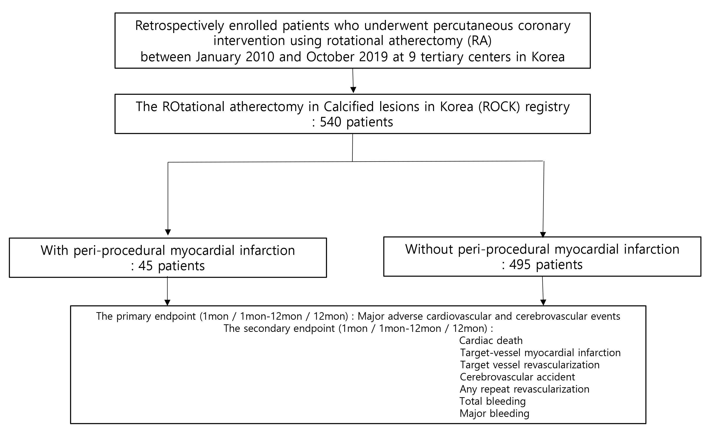 The study population consisted of 540 patients (583 lesions) with severely calcified coronary artery disease (CAD) who underwent PCI using RA from January 2010 to October 2019 at nine tertiary centers in Korea. Patients were included within the ‘ROtational atherectomy in Calcified lesions in Korea (ROCK)’ registry. This registry was approved by the Institutional Review Board (IRB) of each hospital. Data were collected at each center using a standardized case report form to record clinical and demographic characteristics, procedure related data, and follow-up data. Follow-up data were obtained up to 12 months retrospectively based on patients’ medical records and/or telephone interviews conducted by research nurses.
