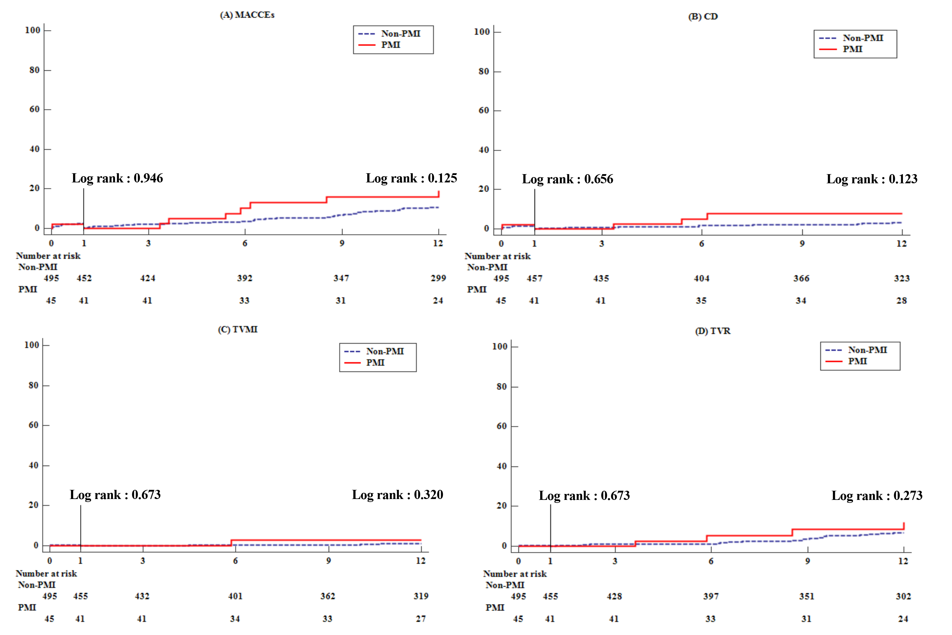 The incidence of MACCE, the primary endpoint, showed no significant difference between the two groups at 1 month, 1–12 months, or 12 months. There was no significant difference in secondary endpoints such as cardiac death, target-vessel MI, TVR, or CVA. Only total bleeding at 1 month showed a tendency to occur more frequently in the PMI group (Fig. 2) (Table 4).