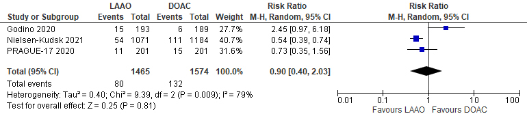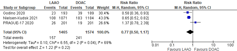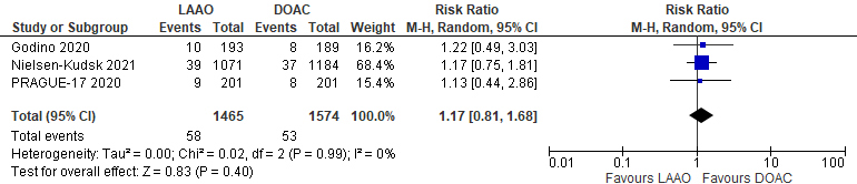 Fig. 2.Forrest plot comparing LAAO to DOAC for the incidence of Ischemicstrokes/TIA.
