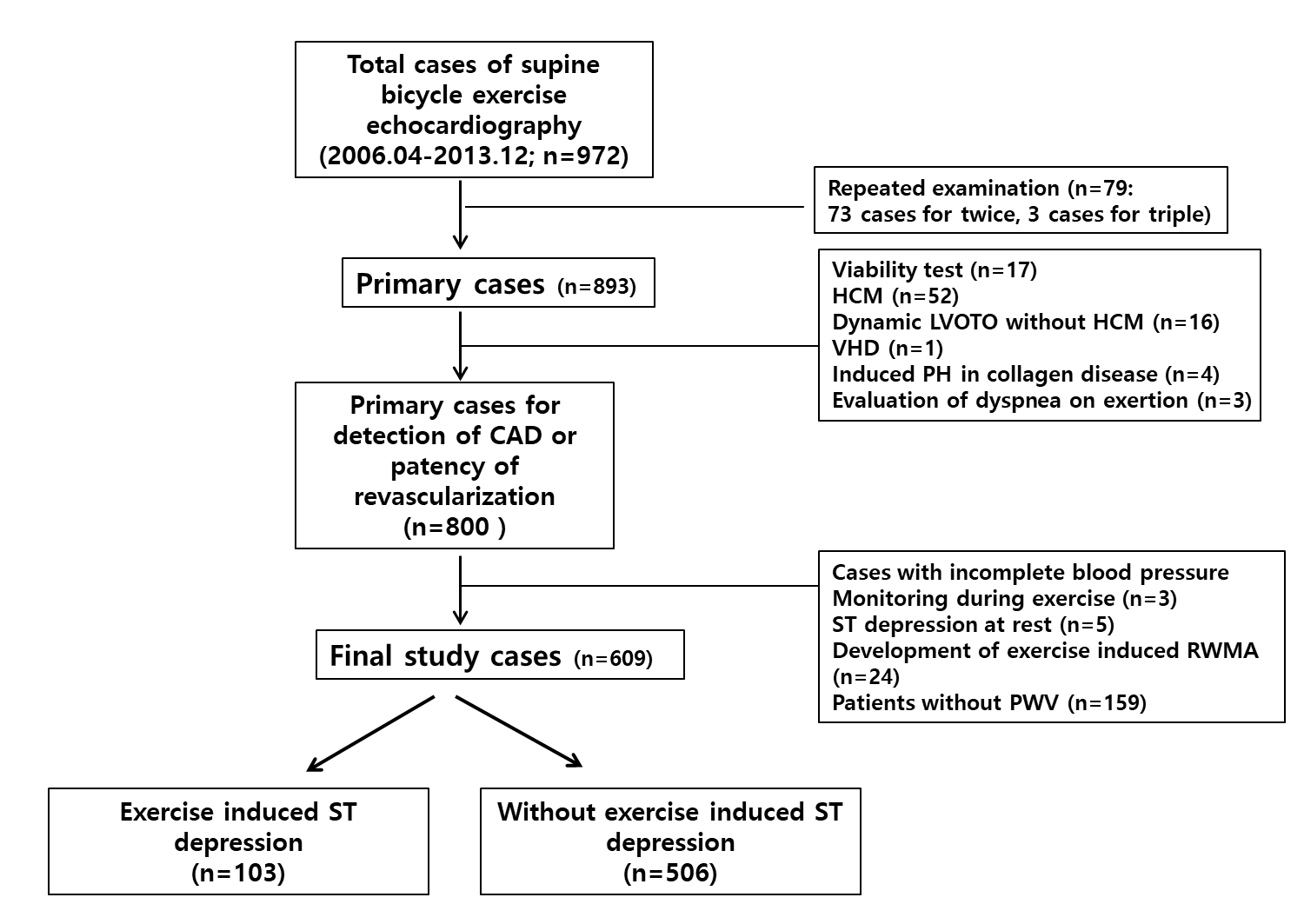 This study had several limitations. First, the patients included in the study were heterogeneous, from presenting symptoms of atypical chest pain to having a history of previous coronary revascularization. Therefore, small coronary vessel diseases or microcirculatory dysfunctional patients could be included. Second, although exercise-induced RWMA was thoroughly interpreted by both sonographers and cardiologists who were experts in echocardiography, by reviewing three short axis views and 4-, 3-, and 2 chamber views, the possibilities of missed RWMA, especially in the right coronary artery or left circumferential artery territory, still existed. However, as we reviewed the results one more time in patients with FST to detect missed RWMA, the possibility of missed RWMA was low. Third, in order to elucidate the potential mechanisms of ST change and its relationship with increased arterial stiffness at peak exercise, LV longitudinal systolic and diastolic function need to be evaluated. Fourth, as higher peak heart rate was linked to FST in our study, delta ST depression/delta heart rate, which has been shown to have higher sensitivity for CAD in a previous study [34], should be applied in future studies. Fifth, as we did not use intravenous atropine to achieve target heart rate due to symptom limited exercise test, some patients did not reach targeted maximal heart rate.
