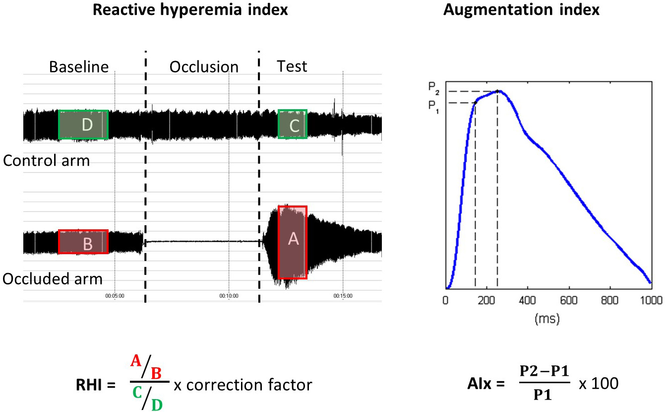 Fig. 1.Calculation of the reactive hyperemia index (RHI) and the augmentation index (Aix) by the EndoPAT2000 software (Itamar Medical).