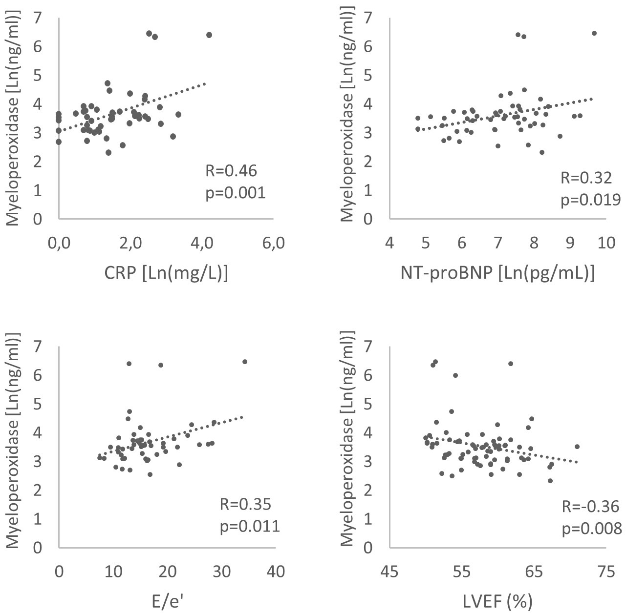 Fig. 3.Correlations between myeloperoxidase and C-reactive protein (CRP), NT-proBNP, E/e’ ratio, left ventricular ejection fraction (LVEF) in heart failure and preserved ejection fraction patients.