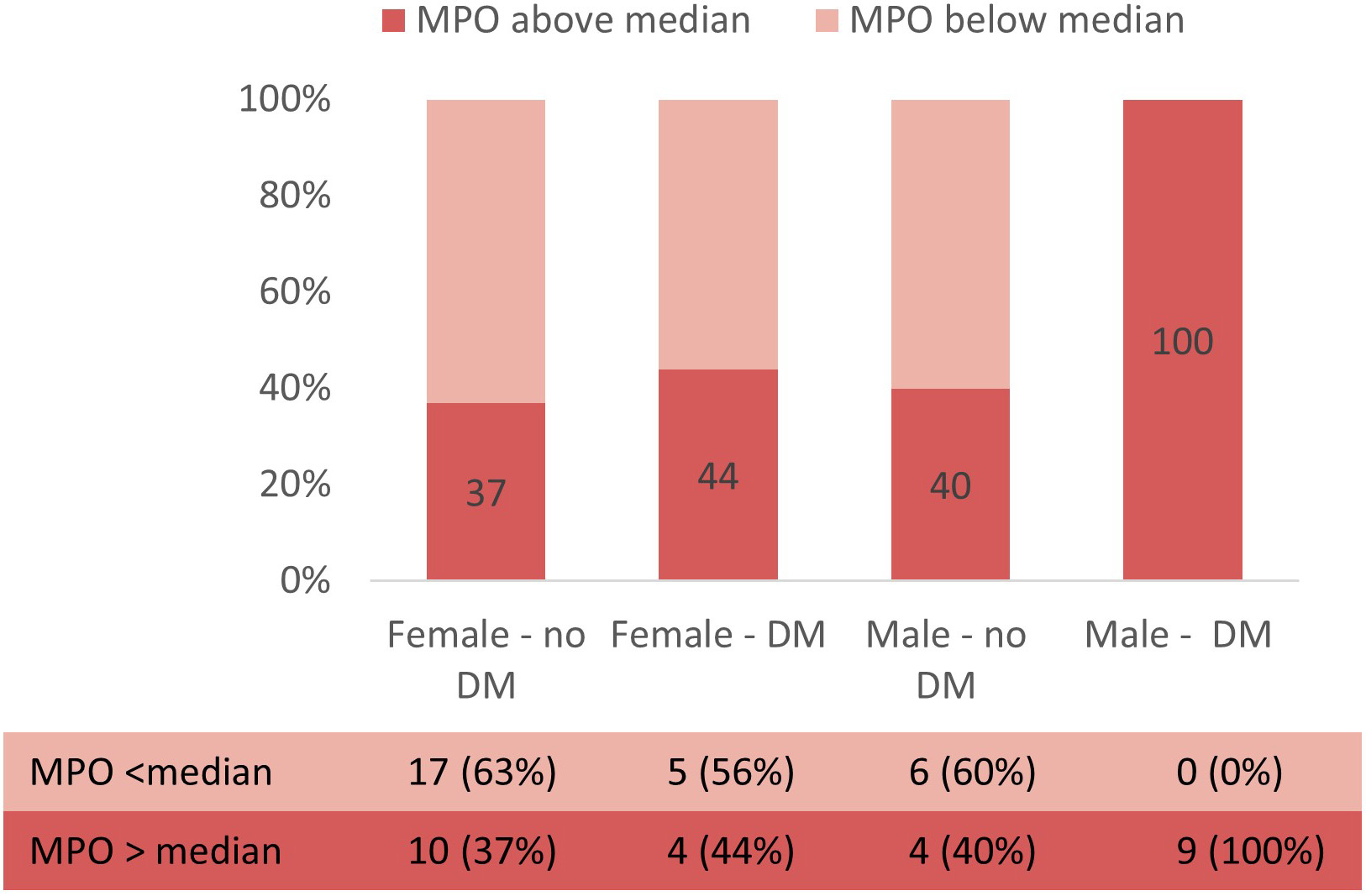 Fig. 4.Proportion of patients with MPO levels above or below median according to sex and diabetic status.