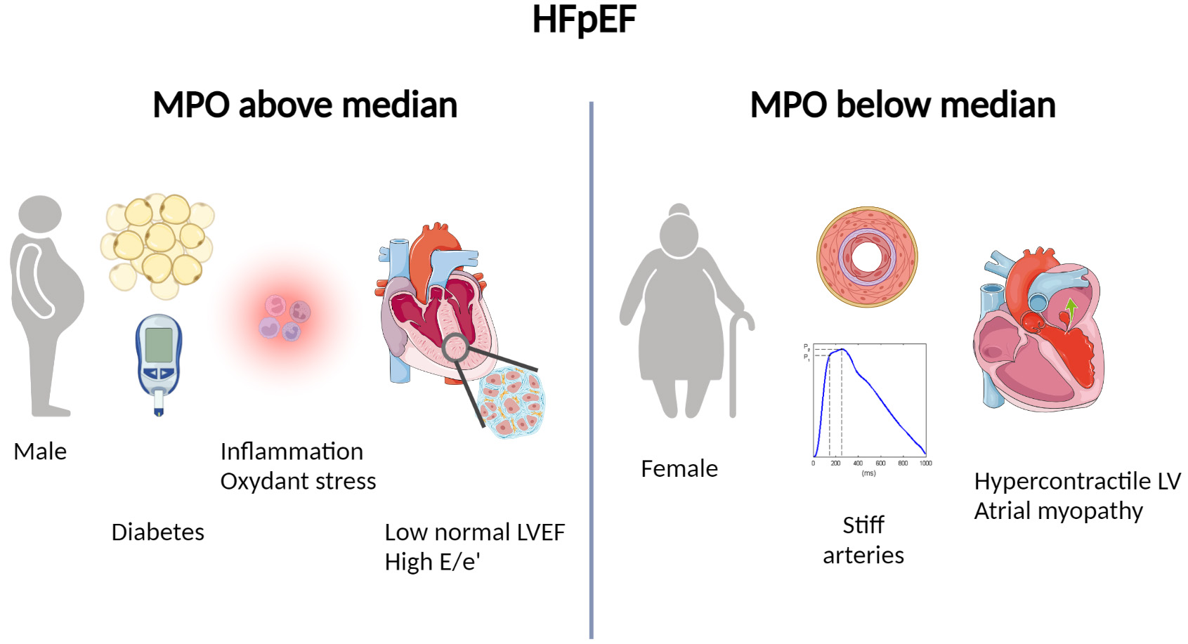 Fig. 5.Illustration of patients’ characteristics associated with levels of myeloperoxidase below or above the median. Patients with heart failure and preserved ejection fraction and myeloperoxidase above the median are more often men, suffer more often form diabetes, show subtle left ventricular dysfunction and pronounced diastolic dysfunction (high E/e’) while patients with myeloperoxidase below the median are more often women with elevated vascular stiffness and high left ventricular ejection fraction.