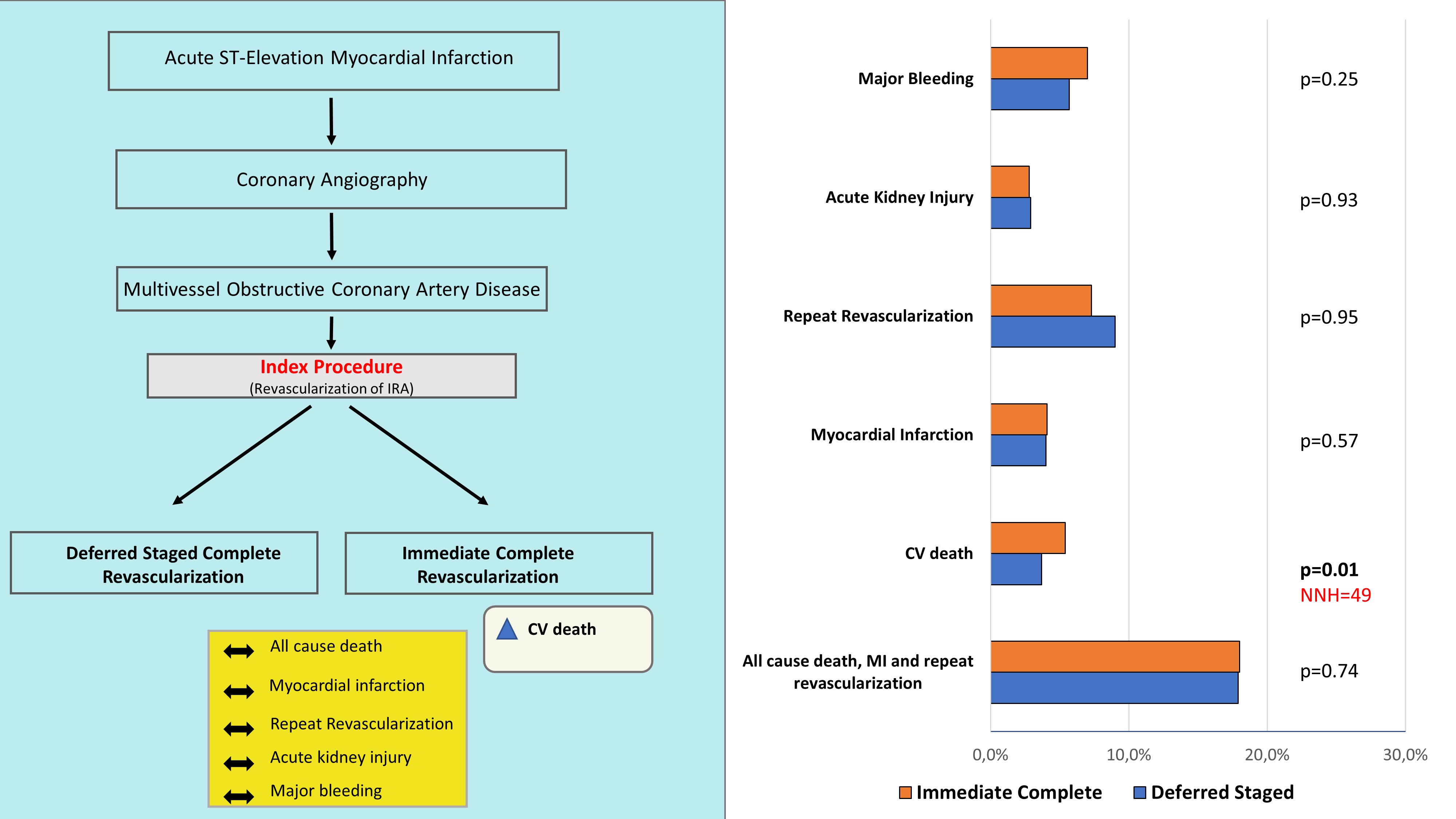 Acute ST-segment Elevation Myocardial Infarction (STEMI) is a life-threatening disorder bringing along a high morbidity load. Hence, it represents a challenge to patients and the society, despite advances in treatment [1]. Percutaneous coronary intervention (PCI) represents a cornerstone for the treatment of patients with Acute Myocardial Infarction (AMI). Above 50% of AMI patients are estimated to have multivessel coronary artery disease (MVD), which is often associated with poorer outcomes [2, 3, 4]. Several randomized trials, including the PRAMI (Preventive Angioplasty in Myocardial Infarction) [5], CvLPRIT (Complete versus Lesion-only Primary PCI trial) [6], DANAMI-3-PRIMULTI (Third Danish Study of Optimal Acute Treatment of Patients with ST-segment Elevation Myocardial Infarction: Primary PCI in Multivessel Disease) [7], COMPARE-ACUTE (Comparison Between FFR Guided Revascularization Versus Conventional Strategy in Acute STEMI Patients With Multivessel Disease After Early PCI for STEMI) [8] and COMPLETE (Complete Versus Culprit-Only Revascularization Strategies to Treat Multivessel Disease After Early PCI for STEMI) [9] trials showed that complete coronary revascularization is superior to culprit-only PCI in reducing the risk of cardiovascular death or re-infarction, or ischemia-driven revascularization. Having confirmed that complete revascularization outperforms culprit-only PCI, a new dilemma has more recently arisen: what is the most effective timing for complete revascularization in MVD patients? Is deferred staged revascularization any different compared to immediate complete revascularization during the index STEMI procedure? A recent meta-analysis found worrisome signals of worse outcomes in AMI patients treated with MV-PCI during the index intervention in the context of cardiogenic shock [10]. However, the jury is still out on the optimal timing of complete revascularization in more hemodynamically stable patients [11, 12, 13].