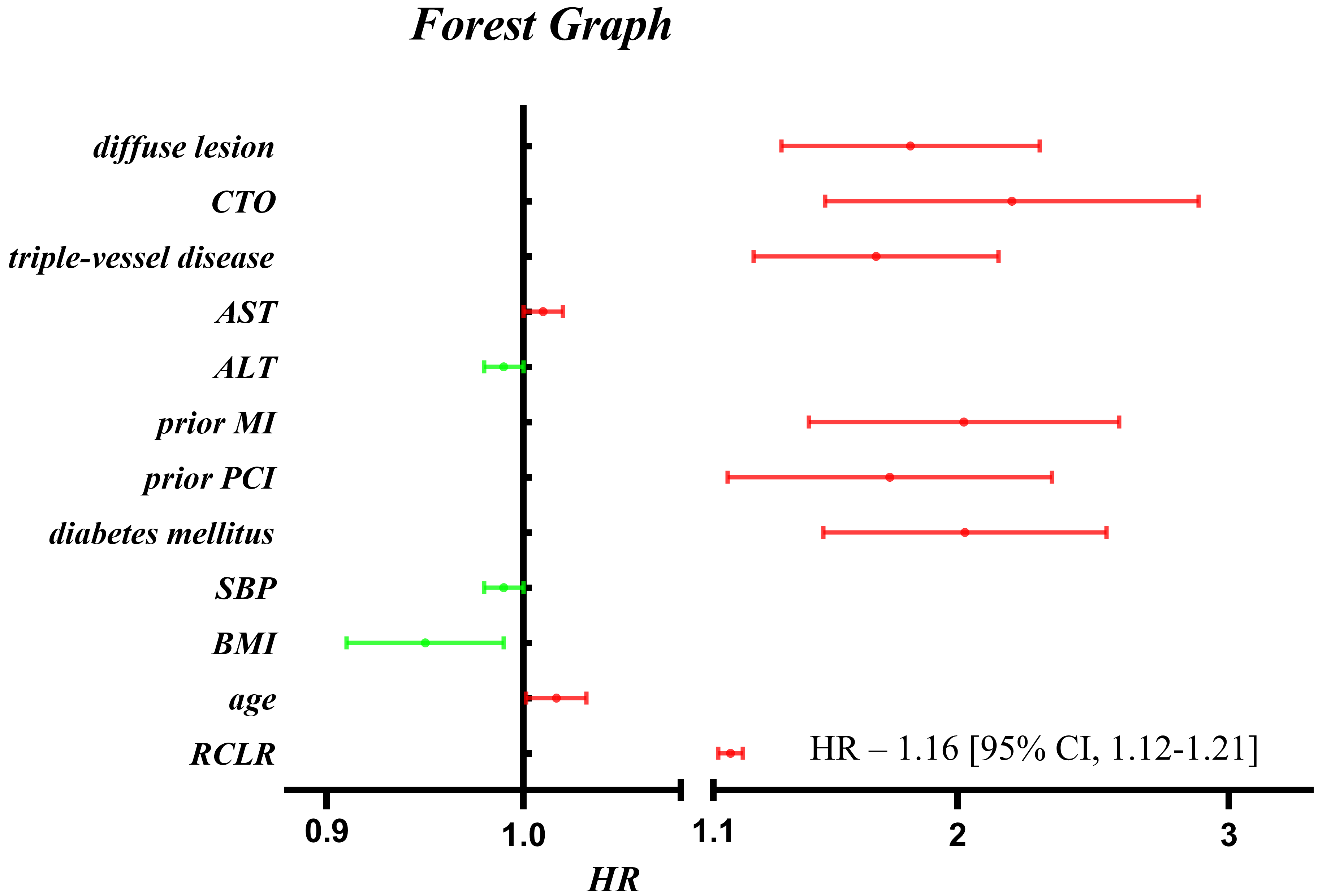 Models were derived from multivariate Cox regression analysis. Multivariable Cox proportional hazards model: adjusted for age, AST, ALT, BMI, SBP, CTO, diffuse lesion, prior MI, triple-vessel disease, prior PCI, diabetes mellitus. Abbreviation: OR, odds ratio; CI, confidence interval.