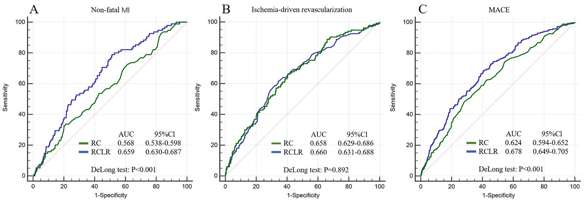 Fig. 3.ROC curves for adverse outcomes. (A) ROC curves of RCLR and RC for non-fatal MI. (B) ROC curves of RCLR and RC for ischemia-driven revascularization. (C) ROC curves of RCLR and RC for MACE.
