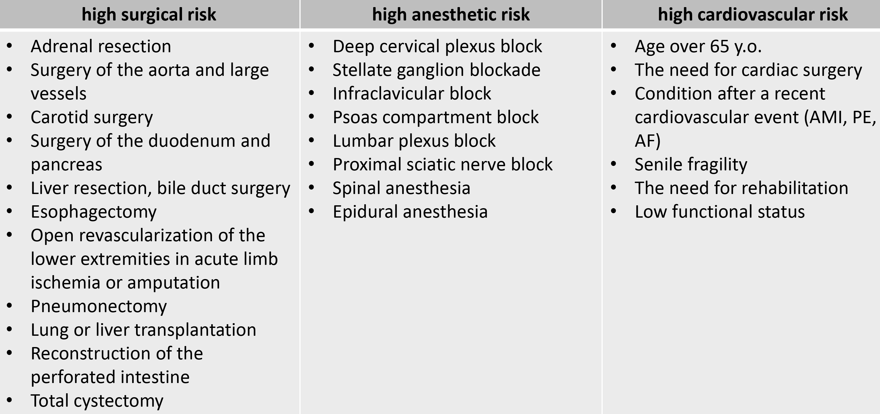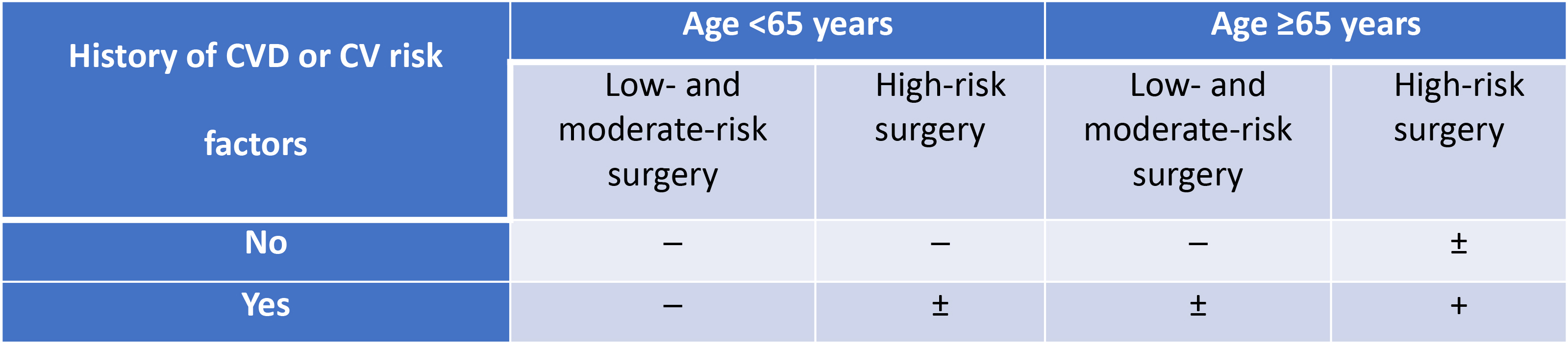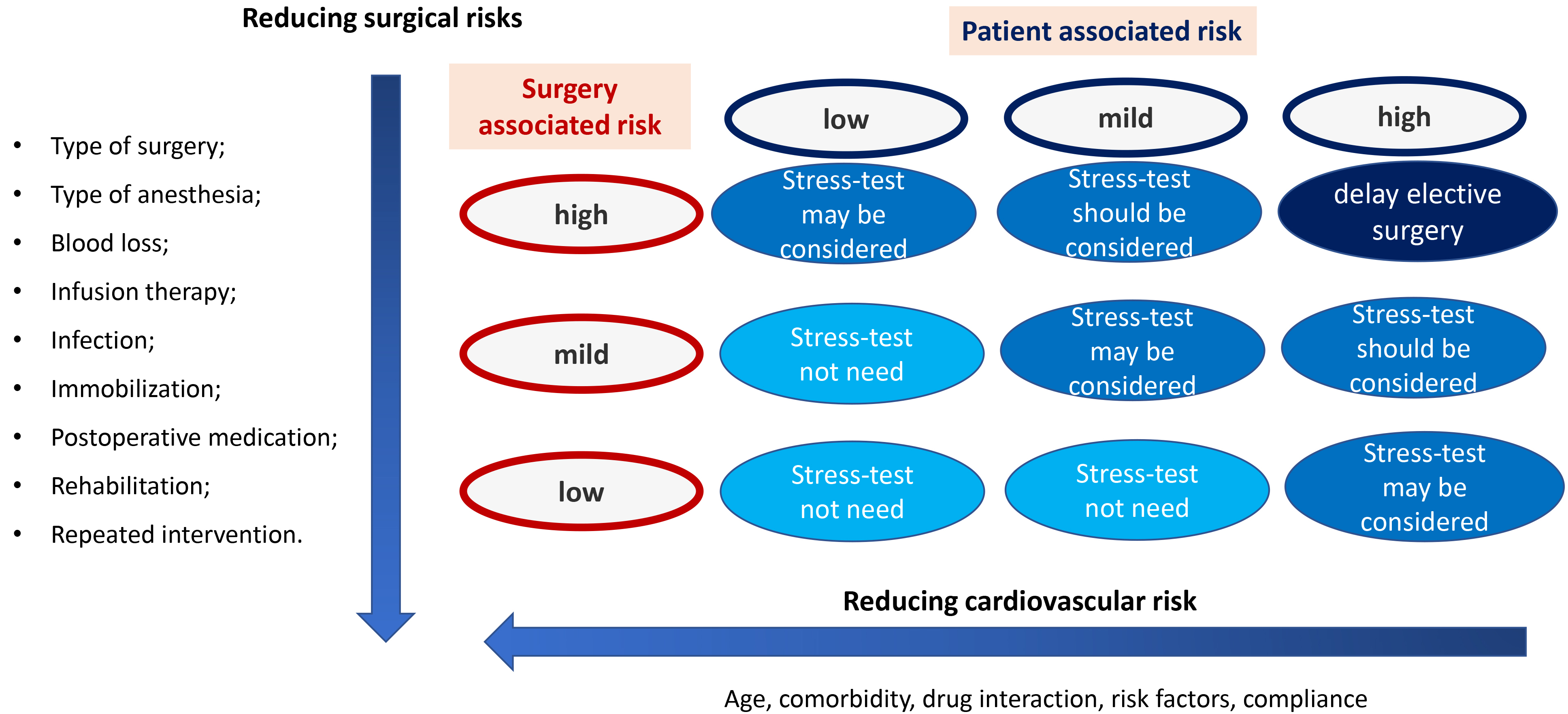 Despite current recommendations for the stratification of cardiac complications of cardiac complications in non-cardiac surgery, preoperative risk assessment remains one of the most difficult clinical tasks and decisions. There is disagreement among physicians about perioperative risk assessment, especially in patients without a history of previously diagnosed cardiovascular (CV) events. Moreover, patients with verified or symptomatic cardiac pathology can lack complete preoperative examination if they have no significant hemodynamic disorders and clinical symptoms at rest. In late August 2022, the European Society of Cardiology (ESC) published its latest guidelines on cardiovascular assessment and management of patients undergoing non-cardiac surgery [1]. This publication provides a step-by-step approach that includes clinical evaluation with risk factors assessment, test findings, estimated outcomes and the burden of surgery, as well as the risks of discontinuing medications. The leading purpose of this approach is to optimize the perioperative patient’s state. Consequently, the guidelines aim to specifically assess risk with the initiation of drug therapy, cardiac manipulation, specific anesthetic, and surgical modalities when necessary, or avoidance of certain medications [1].