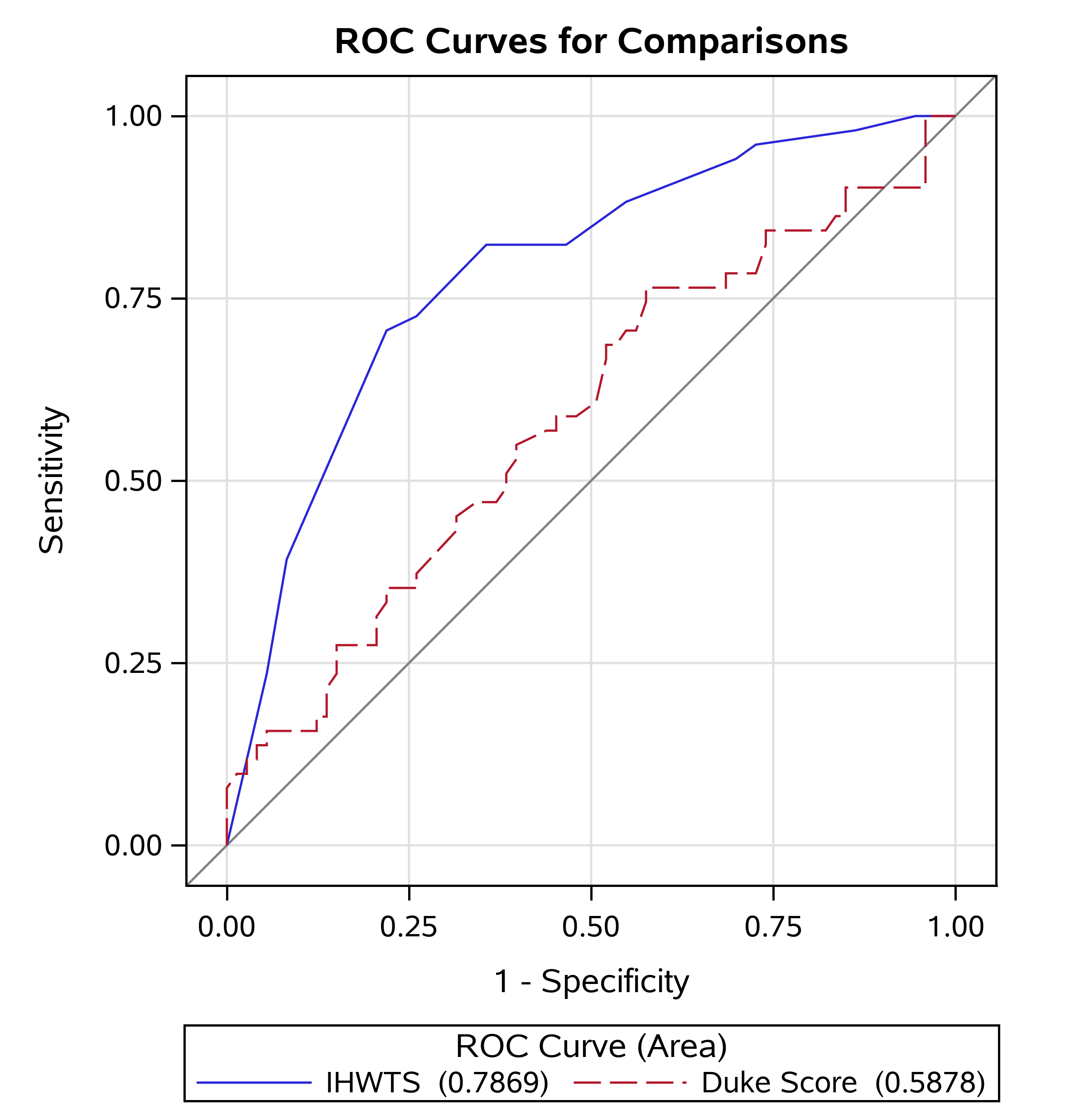Fig. 1.Receiver operating characteristic curves of the Duke Treadmill Score and the High-Workload Treadmill Score. The Intermediate-High-Workload Treadmill Score took into account age, hypertension, and functional aerobic capacity. ROC, receiver operating curves.
