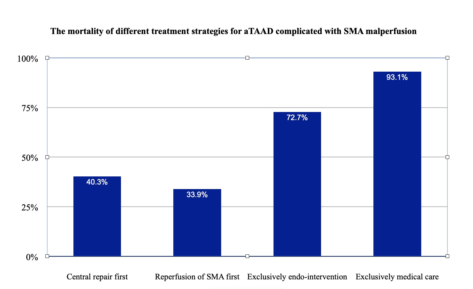 As the two major surgical strategies for treatment of aTAAD with MMP, the survival of patients receiving central aortic repair first versus reperfusion of SMA was notably higher compared with conservative medical treatment (59.7%, 66.1% vs. 6.9%). In retrospect this makes surgical treatment superior to conservative medical treatment options.