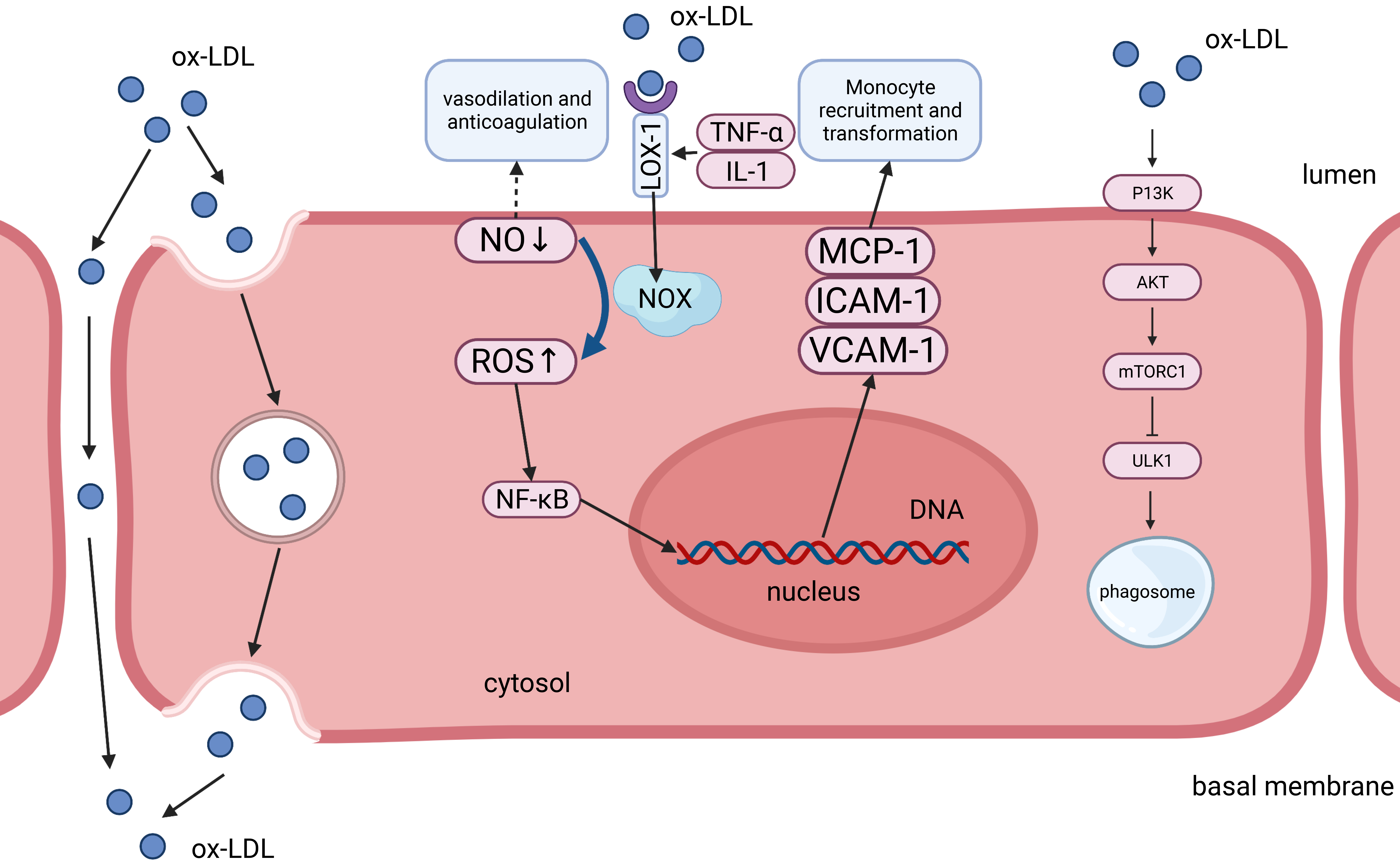 In addition to the role, studies have shown that ox-LDL can also induce autophagy in endothelial cells, suggesting that autophagy may play a role in the degradation of ox-LDL in endothelial cells [37]. Zhang et al. [36] discovered that ox-LDL accumulated in human umbilical vein endothelial cells (HUVECs) and caused an increase in autophagosomes and autophagolysosomes in the cells. The enhancement of ox-LDL-induced autophagy can be inhibited by the Phosphatidylinositol 3-Kinases (PI3K) inhibitor 3-methyladenine and enhanced by the mammalian target of rapamycin (mTOR) inhibitor rapamycin. This suggests that ox-LDL affects the autophagy of endothelial cells through the PI3K/AKT/mTOR signaling pathway (AKT, protein kinase B), and it plays a role in the degradation of ox-LDL.