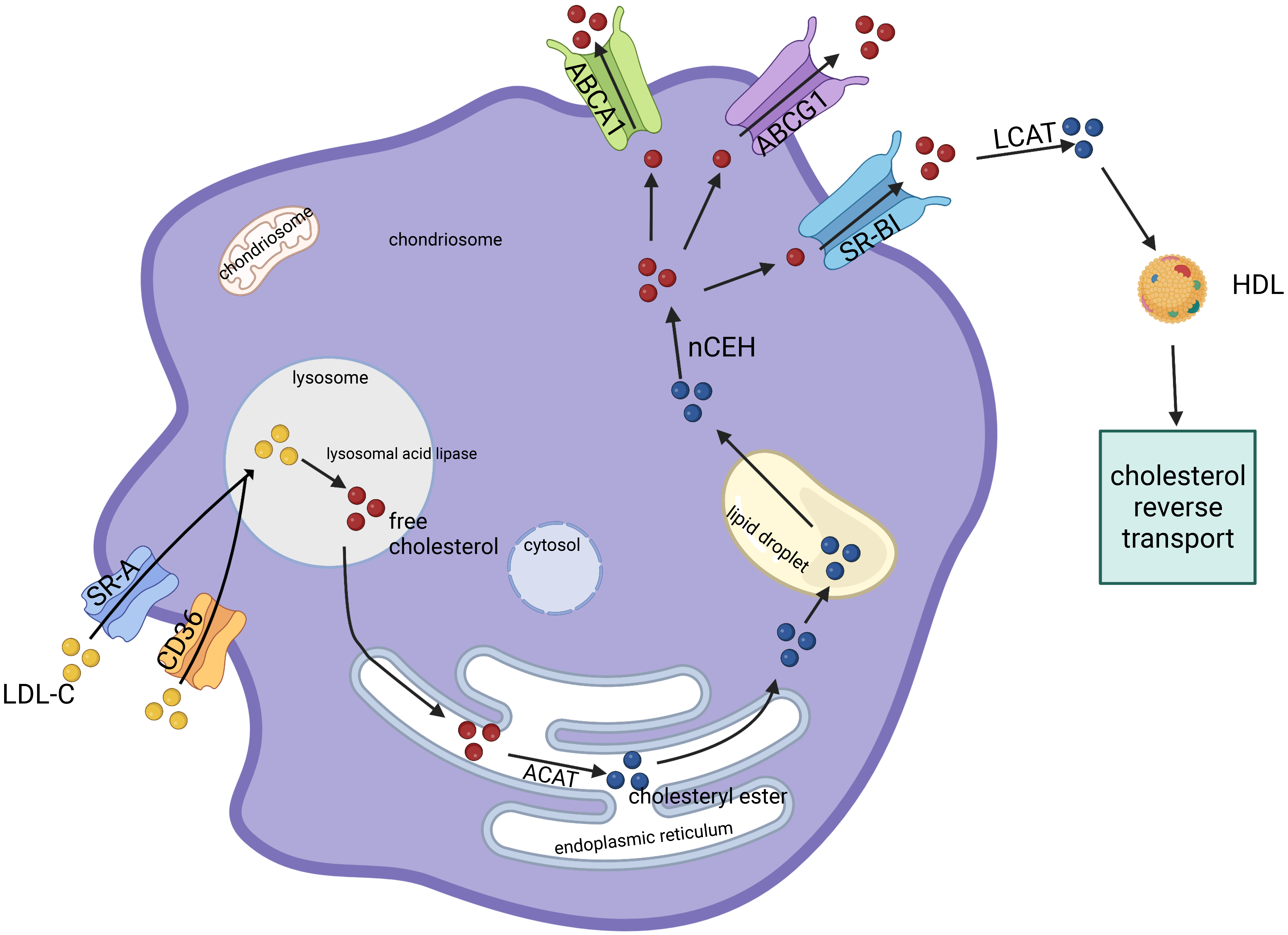 The esterification and hydrolysis cycle of CE is a crucial component of intracellular cholesterol homeostasis maintenance. After cholesterol is ingested, LDL-C is delivered to late endosomes/lysosomes, and CE is hydrolyzed to FC by lysosomal acid lipase. To prevent FC-related cytotoxicity, the released FC is re-esterified by ACAT on the endoplasmic reticulum and stored in cytoplasmic lipid droplets. If this continues, excess CEs will accumulate in the macrophages and form a “foam”. These resynthesized and stored CEs can be hydrolyzed by neutral cholesterol ester hydrolase (nCEH), to liberate FC for the transporter-mediated efflux, which is increasingly regarded as the rate-limiting step in FC efflux [40].