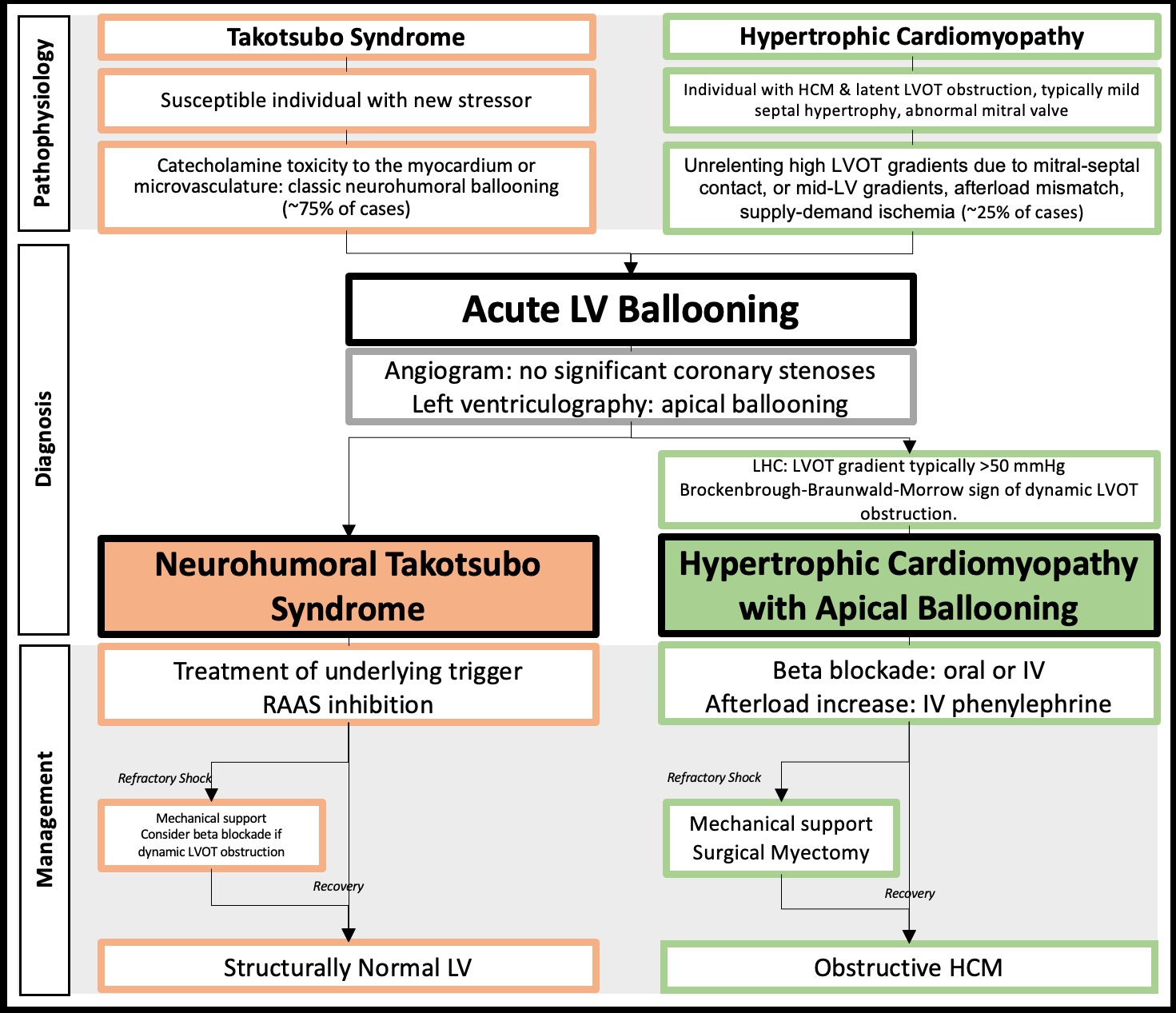 As highlighted in this review, there may be significant overlap in the clinical presentation of neurohumoral TTS and obstructive HCM with apical ballooning. Key features that may help to differentiate these entities include the presence of LVOT obstruction, mitral valve pathology, and the persistence of echocardiographic HCM following acute presentation. Since up to 30% of affected patients may be misdiagnosed, it is important for invasive cardiologists and echocardiographers to explore the key distinguishing features of obstructive HCM from neurohumoral TTS to better determine the diagnosis and tailor therapy. Patients with HCM and LVOT obstruction are treated with intravenous beta blockade and phenylephrine for hypotension. In contrast, patients with neurohumoral TTS are given supportive treatment in the acute setting. Observational data supports the role of RAAS inhibitors in this population, presumably after excluding patients with LVOT obstruction. In patients with HCM and apical ballooning complicated by shock, mechanical support that decreases afterload or preload should be avoided, and VA-ECMO may be preferred if available. Refractory shock may improve after septal reduction therapy, which is often performed with ancillary mitral shortening. Treatment of such patients and their unique pathology requires familiarity with the obstructive HCM ballooning syndrome, as well as a trained and equipped team that is ready to intervene.