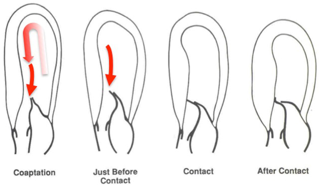 Fig. 2.The cardiac loop and SAM of the mitral valve. Flow within the LV follows a U-turn redirection between the LV inflow and outflow tracts, and goes around the mitral valve. The close proximity of the LV inflow and outflow tracts makes this anatomy susceptible to small perturbations, resulting in SAM in vulnerable individuals. In obstructive HCM, the mitral valve is swept into the septum by the pushing force of flow, also known as flow drag. Flow originates from a posterior and lateral direction, redirected by the septal bulge. As it does so, flow catches the mitral valve from its ventricular aspect and sweeps it into the septum. Reproduced by permission of the authors [52]. SAM, systolic anterior motion; LV, left ventricle; HCM, hypertrophic cardiomyopathy.