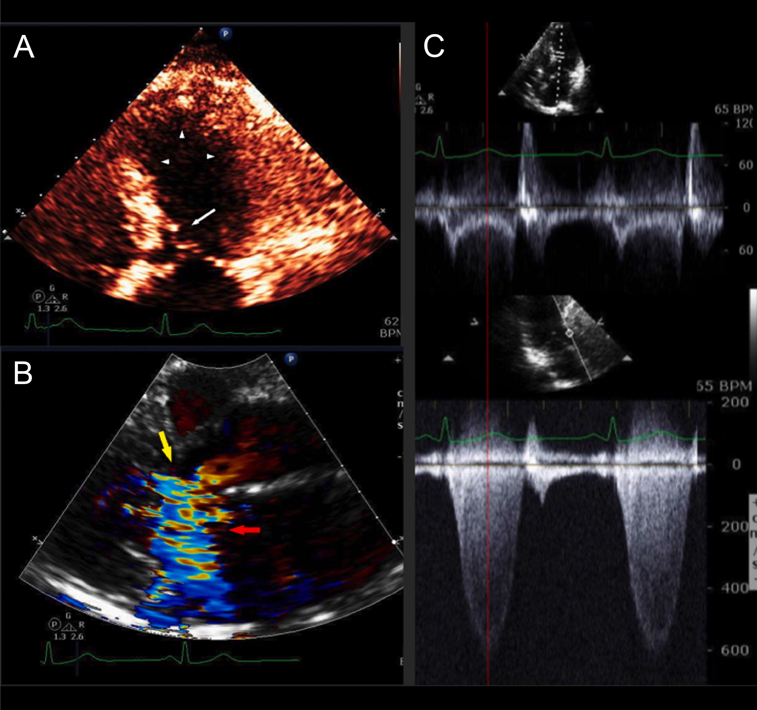 Fig. 3.HCM with mild asymmetric septal hypertrophy, LVOT obstruction, and acute apical ballooning syndrome. A 63-year-old woman was admitted with near-syncope, hypotension, and NSTEMI (troponin I of 0.64 ng/mL). Coronary arteries were angiographically normal. LV cineangiography revealed acute apical ballooning. Left heart catheterization revealed an aortic pressure of 89/51 with a gradient of 100 mmHg. Following intravenous metoprolol, the patient’s outflow tract gradient improved to 40 mmHg, and her BP improved to 105/80 mmHg. A stress TTE performed 22 months after presentation demonstrated normal LV wall motion and no resting gradient. Following stress, TTE revealed mitral-septal contact and a peak LVOT gradient of 81 mmHg. This patient had very mild septal thickening HCM with acute apical ballooning due to LVOT obstruction presenting clinically as TTS. After recovery of LV systolic function, she continued to have severe LVOT gradients provocable after exercise. (A) Echocardiogram performed on admission (systolic frame) revealed apical and mid-LV ballooning with severe hypokinesis (arrowheads) and mitral-septal contact (white arrow). (B) Color Doppler (systolic frame) demonstrated severe mitral regurgitation (MR) (red arrow) and turbulence in the LV outflow tract (yellow arrow). (C) Pulsed-wave (PW; top) and continuous wave (CW; bottom) Doppler tracings obtained on admission TTE. PW Doppler at the level of the LVOT revealed a mid-systolic drop in PW Doppler velocities (“lobster claw abnormality”). The nadir in the drop of the PW Doppler corresponds to the peak of the CW gradient in the outflow tract (139 mmHg, bottom), as shown by the red dotted line. The PW velocity in mid-systole is low at 20 cm/sec, due to LV systolic dysfunction. Reproduced with permission Am J Cardiol [9]. HCM, hypertrophic cardiomyopathy; LVOT, left ventricular outflow tract; NSTEMI, Non-ST segment elevation myocardial infarction; LV, left ventricle; TTE, transthoracic echocardiogram; TTS takotsubo syndrome.