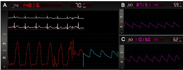 Fig. 4.Left heart catheterization and peak-to-peak pressure tracings of the patient described in Fig. 3, obtained using a retrograde pullback approach. (A) Pullback method for LV and aortic pressure tracings demonstrate a 60 mmHg gradient across the LVOT. (B) Aortic pressure tracings in the catheterization laboratory demonstrate a hypotensive patient with a systemic blood pressure of 87/51 mmHg. (C) Given the concern for acute apical ballooning due to severe LVOT obstruction in HCM, the patient was administered IV metoprolol 15 mg. Fifteen minutes later, aortic pressure tracings demonstrate improved systemic blood pressures to 110/60 mmHg, as well as an improved LVOT gradient to 40 mmHg. LV, left ventricle; LVOT, left ventricular outflow tract; HCM, hypertrophic cardiomyopathy; IV, intravenous.