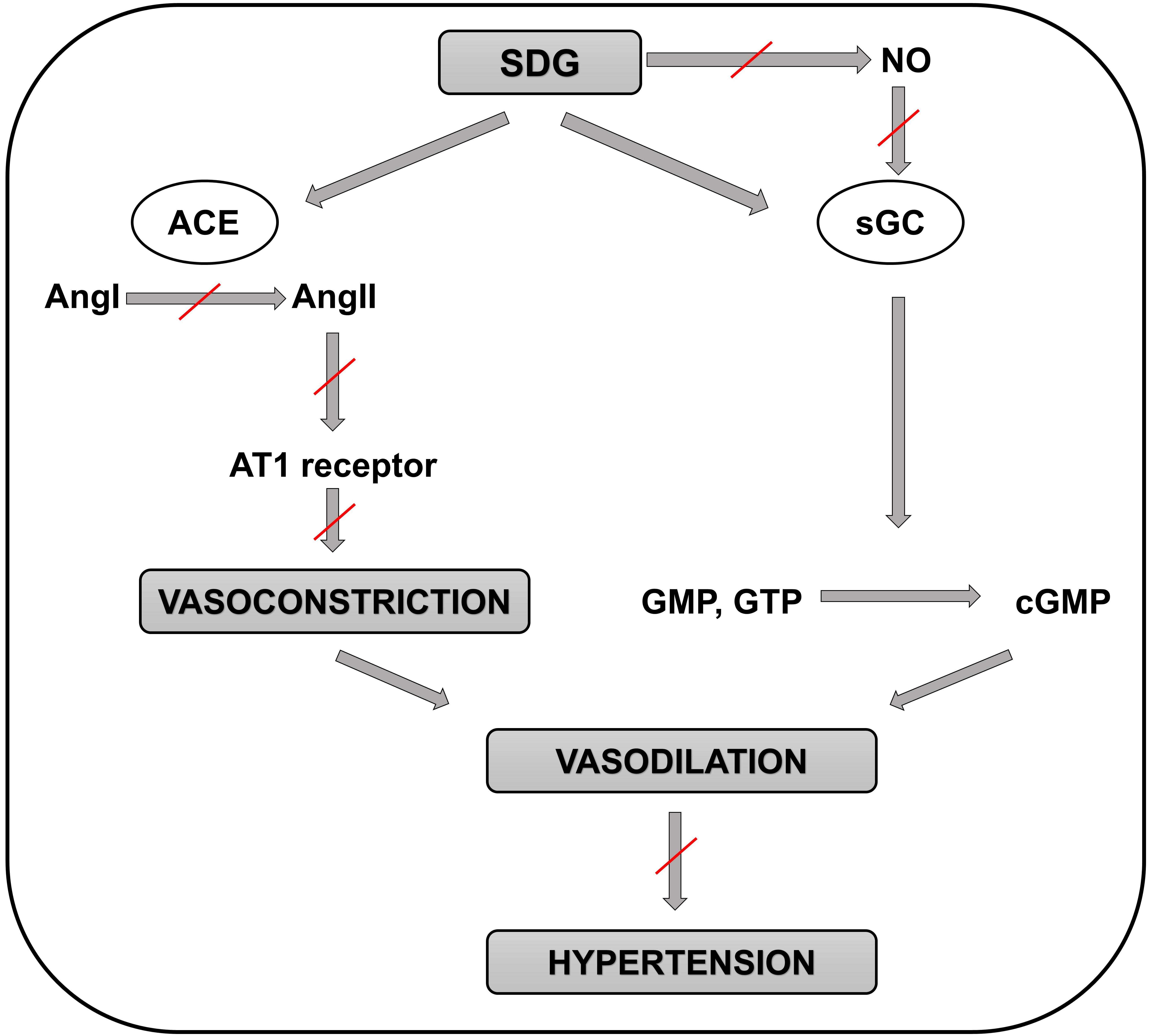 Animal studies evaluating effects of the major polyphenol contained in flaxseed oil, SDG, on BP demonstrated very similar results as the flaxseed oil itself. Prasad et al. [74] found that small doses of SDG (3 and 5 mg/kg) caused dose-dependent decreases in the systolic, diastolic, and mean arterial pressures in rats which probably are not mediated via NO signaling despite these BP-lowering effects might be due to guanylate cyclase activation. Further, higher dose of SDG (10 mg/kg) caused significant decreases in the arterial pressures with more pronounced antihypertensive effect on diastolic pressure in rats, likely via ACE/AngI/AngII inhibition [75] (Fig. 2). Finally, SDG (25 mg/kg) exerted antihypertensive effects in an animal model of monocrotaline-induced pulmonary arterial hypertension (PAH) in rats likely via improving redox homeostasis [76].