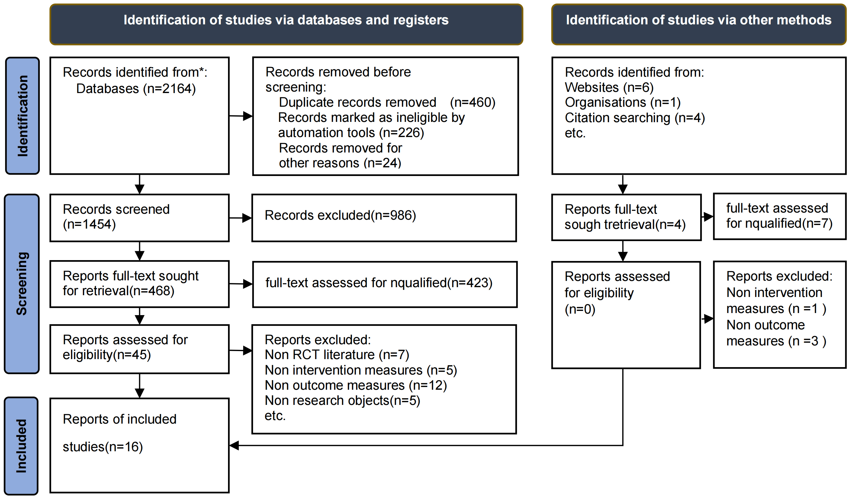 The studies identified during the literature screening process are summarized in Fig. 1. A total of 2164 records were retrieved in our database search, of which 11 articles were obtained by snowballing. After removing the duplicate items, we identified 1454 relevant records, of which only 45 were full-text articles. From these full-text articles, only 16 papers met the eligibility criteria stated above. Later, we searched for all references that ultimately included evidence. However, no other articles identified through this search met the eligibility criteria.