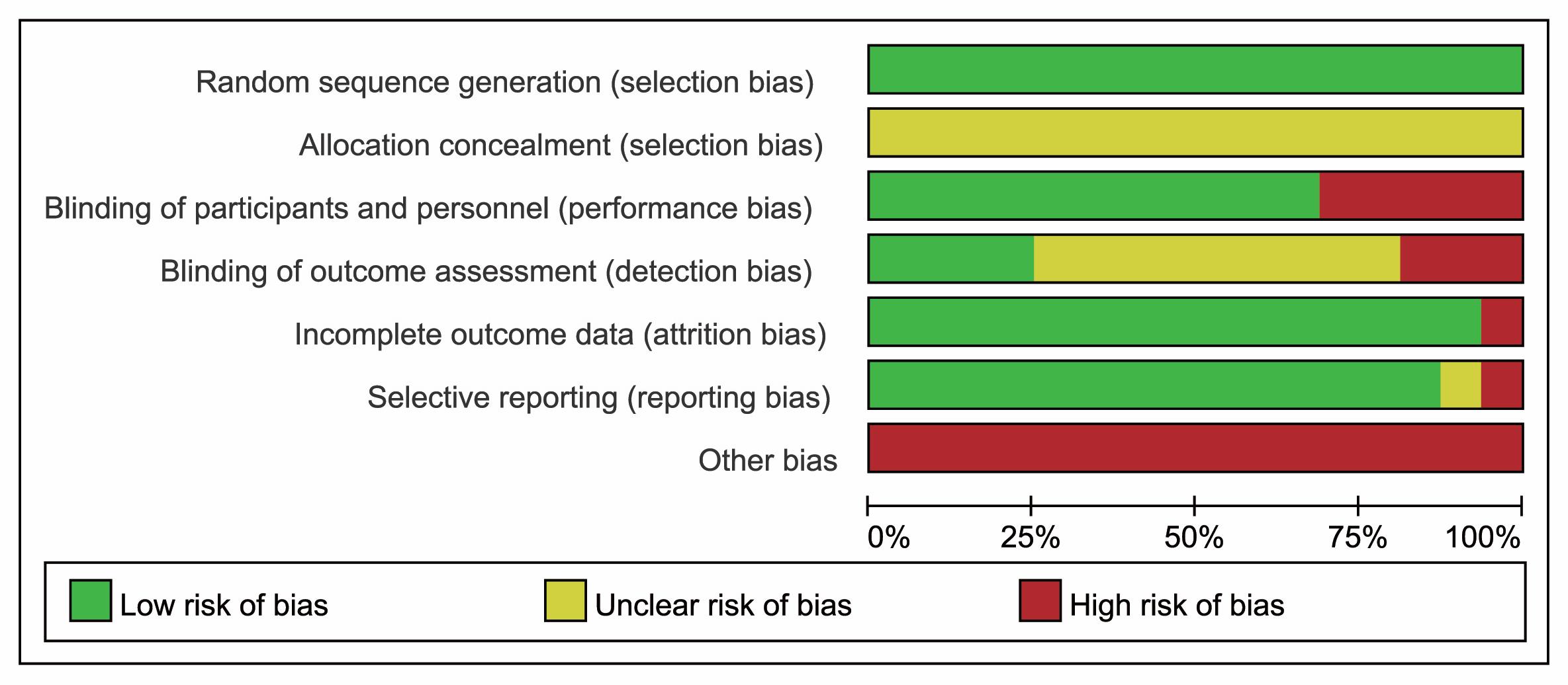 The included studies were assessed for bias in accordance with the evaluation of the authenticity of RCT criteria published by the Cochrane Collaboration Network. This assessment is based on seven criteria: random sequence generation, allocation concealment, blinding of participants and personnel, blinding of outcome assessment, incomplete outcome data, selective reporting, and other biases. Two reviewers (Luo and Zhang) independently applied the risk assessment tools to all included studies and classified the risk bias of each study as low-risk, high-risk, or unclear. A justification for the classification was also provided. Any differences in determining the risk of bias or justification were resolved through discussions between the two reviewers (Luo and Zhang). If necessary, a third reviewer (Wang) acted as an arbitrator.