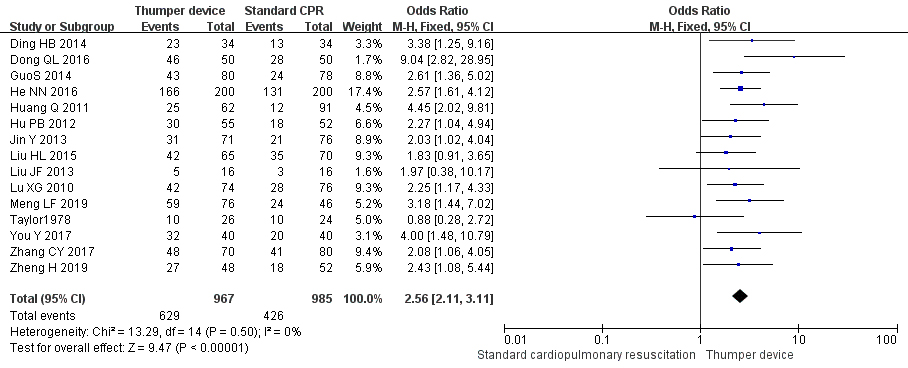 Fig. 4.The discharge survival rate forest plot of Thumper chest compression versus manual chest compression. CPR, cardiopulmonary resuscitation; CI, confidence interval.