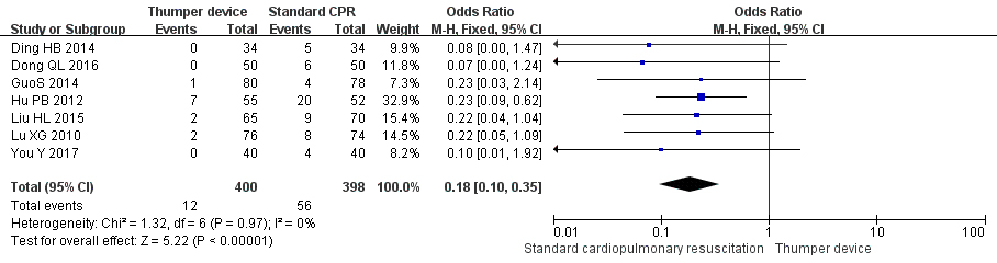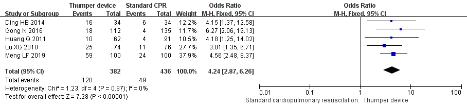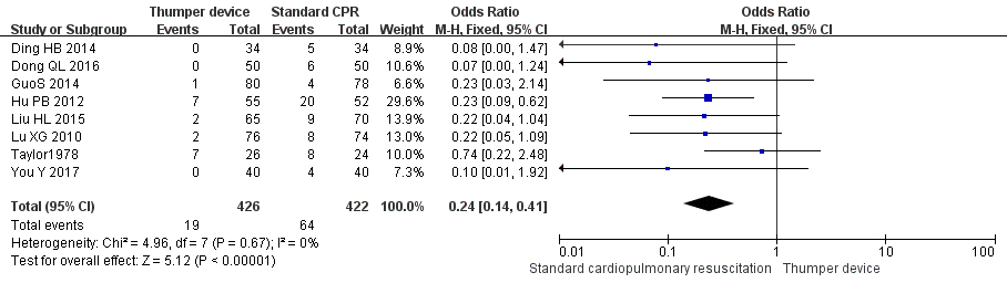 To our knowledge, there is currently no meta-analysis comparing the survival and prognosis between the Thumper and manual chest compressions.