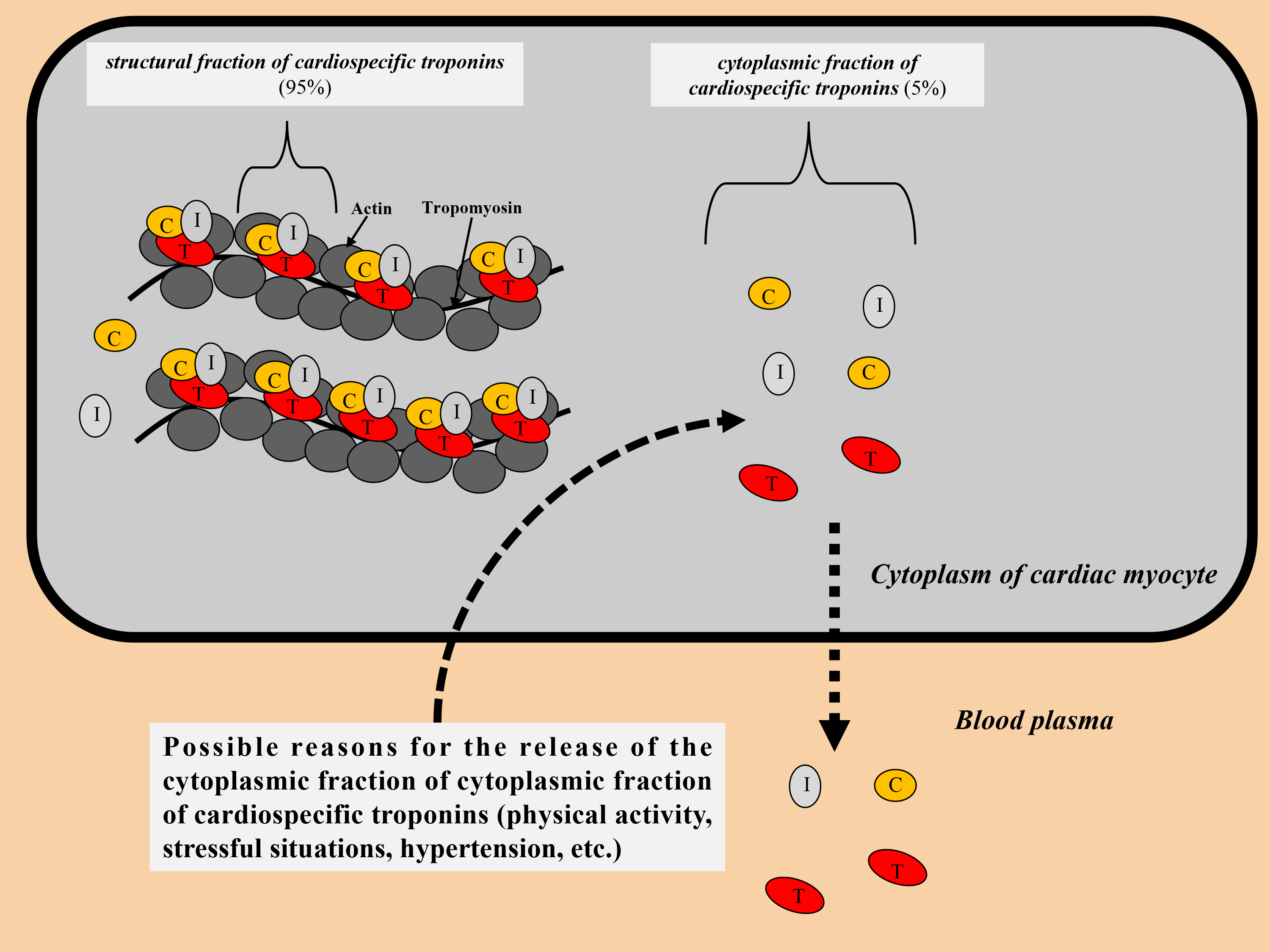 The most part of the cardiospecific troponins (approximately 90–95%) is associated with myofilaments, and a small concentration (5–10%) is in a free state in the cytosol (Fig. 1). After damage to the cell membrane of cardiac myocytes as a result of exposure to a number of adverse factors (for example, ischemia, inflammatory cytokines, cardiotoxic agents, etc.), cardiospecific troponin molecules are initially released from the cytoplasm of cardiac myocytes into the interstitium, and then into the general bloodstream. Protein molecules of troponin T and troponin I are localized in cardiac myocytes and skeletal myosymplasts, but they are encoded by different genes in each type of muscle, resulting in the formation of two different immunochemical products. Laboratory diagnostic studies of cardiovascular pathology, in particular myocardial infarction, are based on the use of high-affinity anti-troponin antibodies against cardiospecific troponin T and cardiospecific troponin I [16, 17, 18].