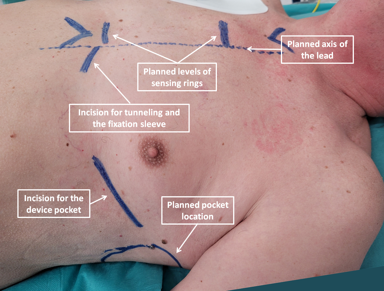 As mentioned above, preoperative planning should define the future locations of the system components. The anatomical landmarks may be marked on patient’s skin before implantation, and a dummy system may be used together with fluoroscopy to plan the position of the system and skin incisions. Fluoroscopy is especially useful in case of atypical anatomy of the chest and/or the heart. An example of preoperative planning and marking of the anatomical landmarks and skin incisions is presented in Fig. 2.
