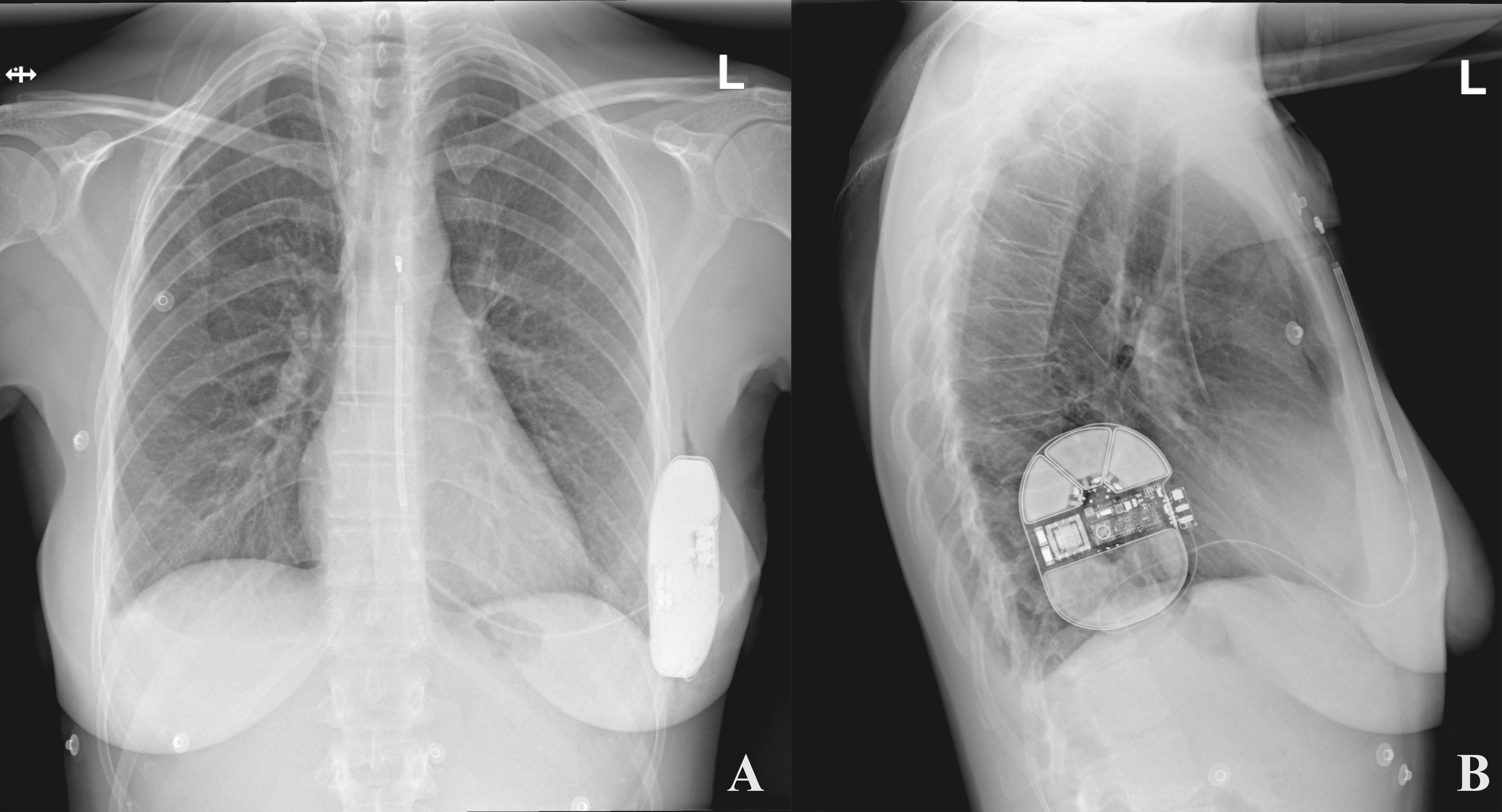 Fig. 3.An exemplary postoperative chest x-ray presenting an appropriate position of the S-ICD system. (A) Postero-anterior view. (B) Lateral view. Note the posterior location of the can, which is typically obtained with the intermuscular pocket. S-ICD, subcutaneous implantable cardioverter-defibrillator.