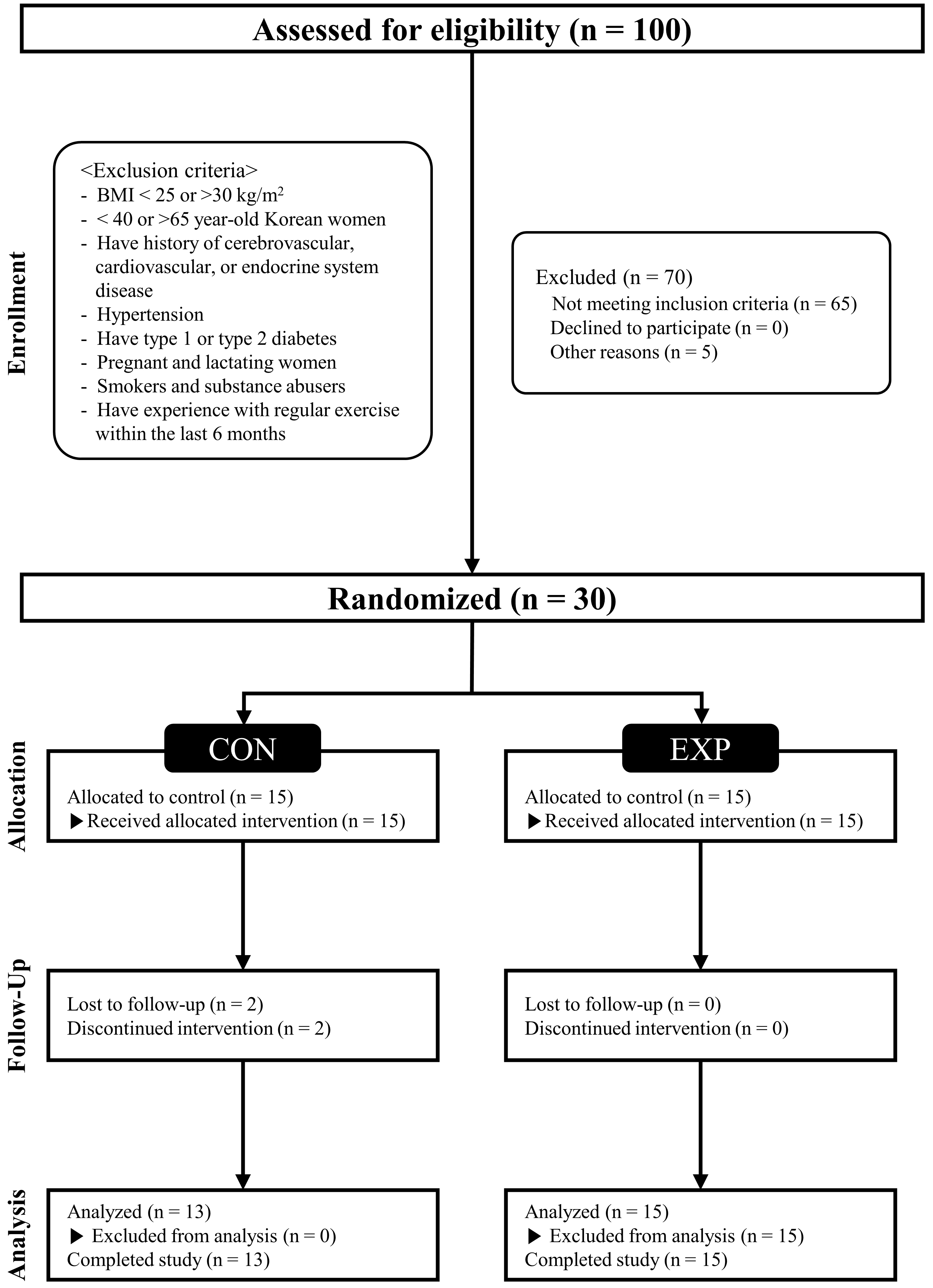 Fig. 1.CONSORT (Consolidated Standards of Reporting Trials) flow diagram. CON, control group; EXP, experimental group; BMI, body mass index.