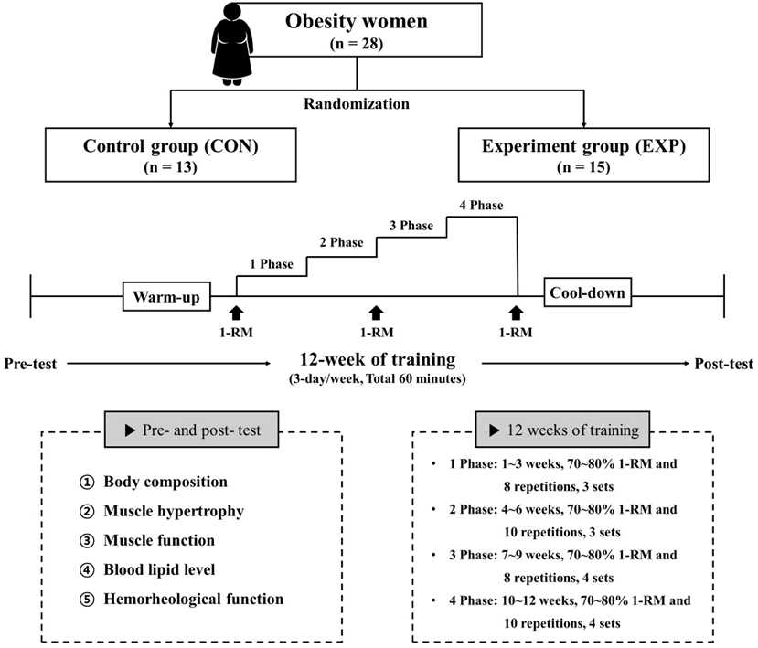 After the testing session, the participants were randomly assigned to the CON, which maintained the same daily lifestyle as before, or the EXP, which underwent a resistance training program. The resistance training program consisted of 10 min of warm-up, 60 min of the main exercise, and 10 min of cool-down; the rest period between each exercise and the next was set within 1–2 min. The warm-up and cool-down consisted of dynamic and static stretching, respectively; resistance training consisted of four movements of the upper body (bench press, preacher bench biceps curl, barbell rowing, and dumbbell shoulder press) and four movements of the lower body (deadlift, barbell squat, seated leg extension, and lying leg curl). The main resistance exercise consisted of 3–4 sets of 8–10 repetitions at 70–80% of one repetition maximum (1-RM) after measuring 1-RM. The training frequency was 80 min, 3 days per week, for 12 weeks. The number of repetitions and sets was increased every 3 weeks according to the principle of increasing the load of exercise prescription (Fig. 2). The resistance training program were performed at a gym in Seoul, and a health trainer residing at the gym fully understood our training program and guided the participants to perform the exercise.