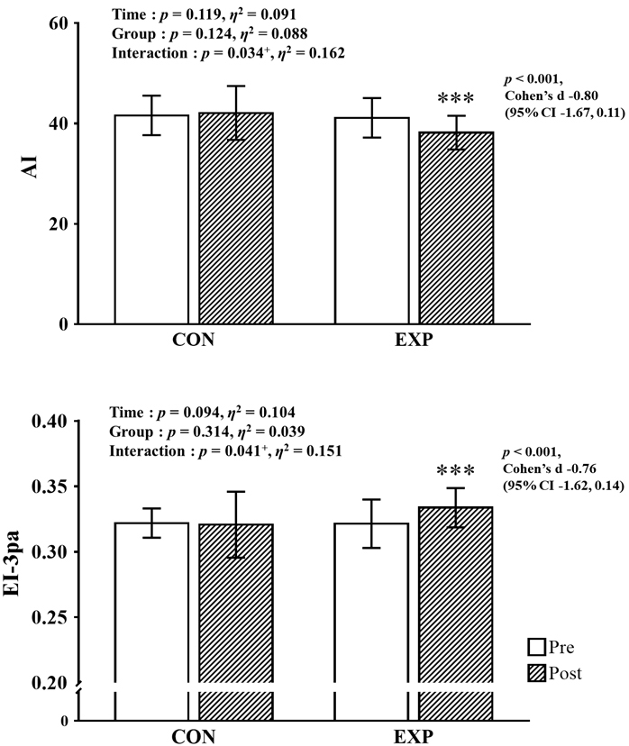 | Variables | CON (n = 13) | EXP (n = 15) | p (η | ||||||
