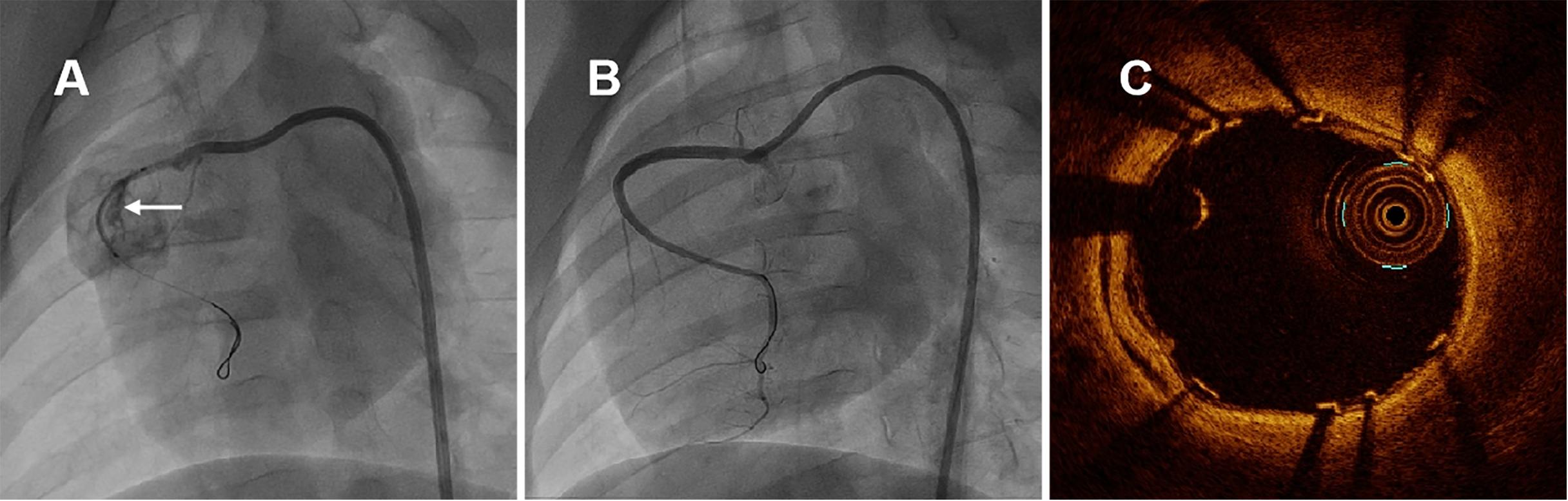 Fig. 2.Representative coronary angiographies and OCT image in swine immediately after covered stenting. (A) Coronary artery perforation was induced by non-compliant balloon burst and self-made covered stent was positioned in RCA, the white arrow indicated the perforation of coronary nature architecture. (B) CAG of RCA immediately after covered stenting. (C) OCT examination immediately after covered stenting. CAG and OCT examination revealed that the new covered stent was sufficient expansion without malapposition, meanwhile with pretty blood flaw. OCT, optical coherence tomography; RCA, right coronary artery; CAG, coronary angiography.