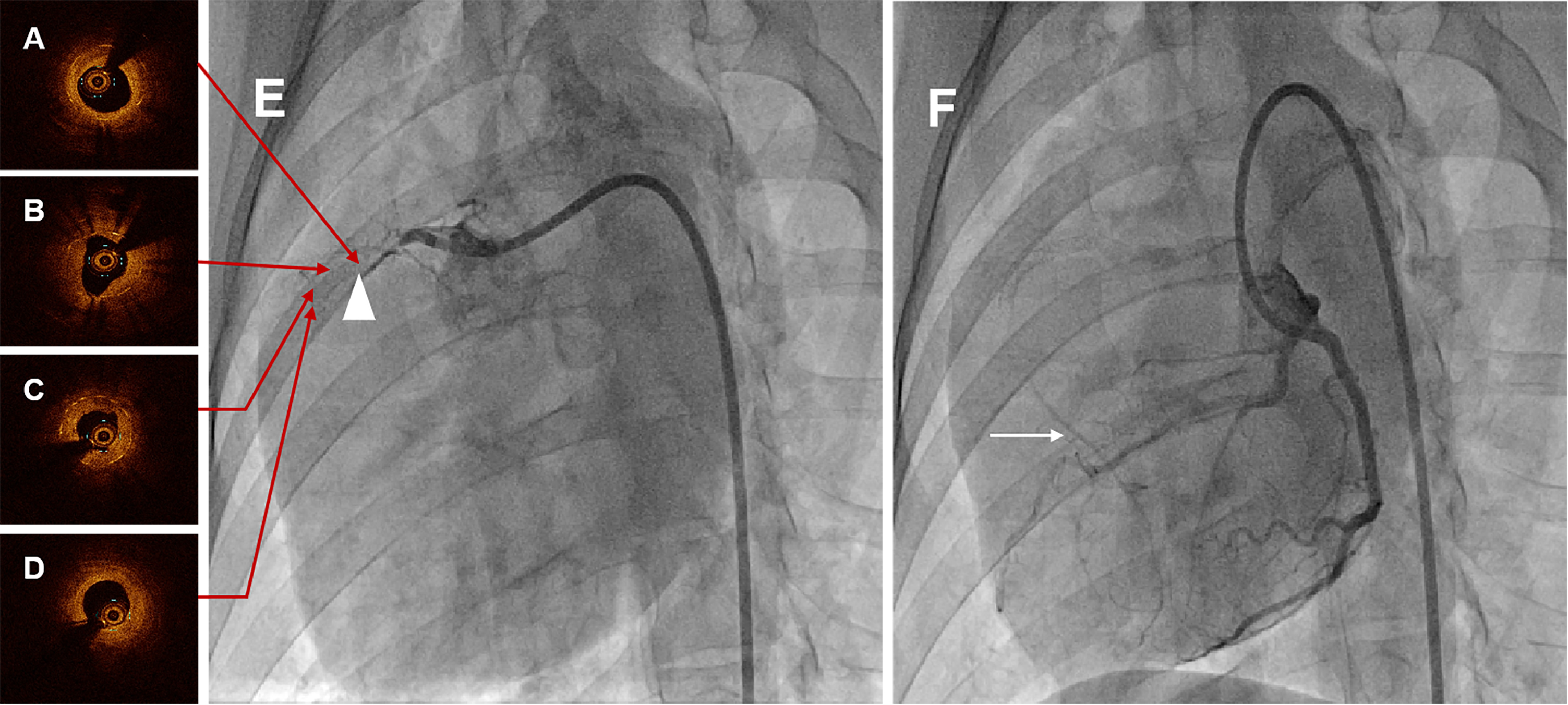 Fig. 3.Representative coronary angiographies and OCT images in swine at six months. (A) Proximal OCT image of the occlusion lesion after interventional recanalization. (B) Proximal-middle OCT image of the occlusion lesion after interventional recanalization. (C) Middle-distal OCT image of the occlusion lesion after interventional recanalization. (D) Distal OCT image of the occlusion lesion after interventional recanalization. Serial OCT images visualized the diffuse heterogeneous fibrous plaques, as well as organized thrombosis, lipid deposits and several neoatherosclerosis in the occluded segment. (E) CAG of RCA in swine at six months, and the white triangle indicated the occluded stented lesion. (F) CAG of LCA in swine at six months, and the white arrow was the collateral circulation. CAG at six months showed total occlusion at the stented segment with pretty collateral circulation. OCT, optical coherence tomography; CAG, coronary angiography; RCA, right coronary artery; LCA, left coronary artery.