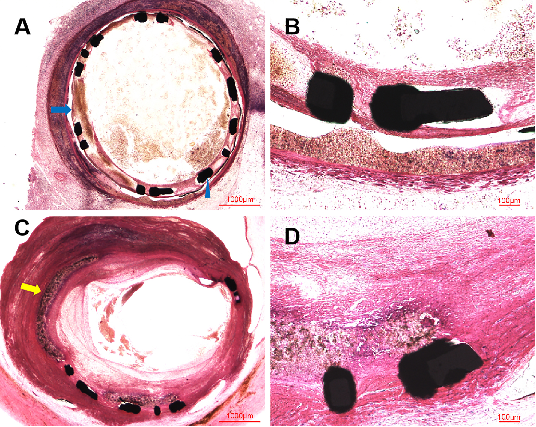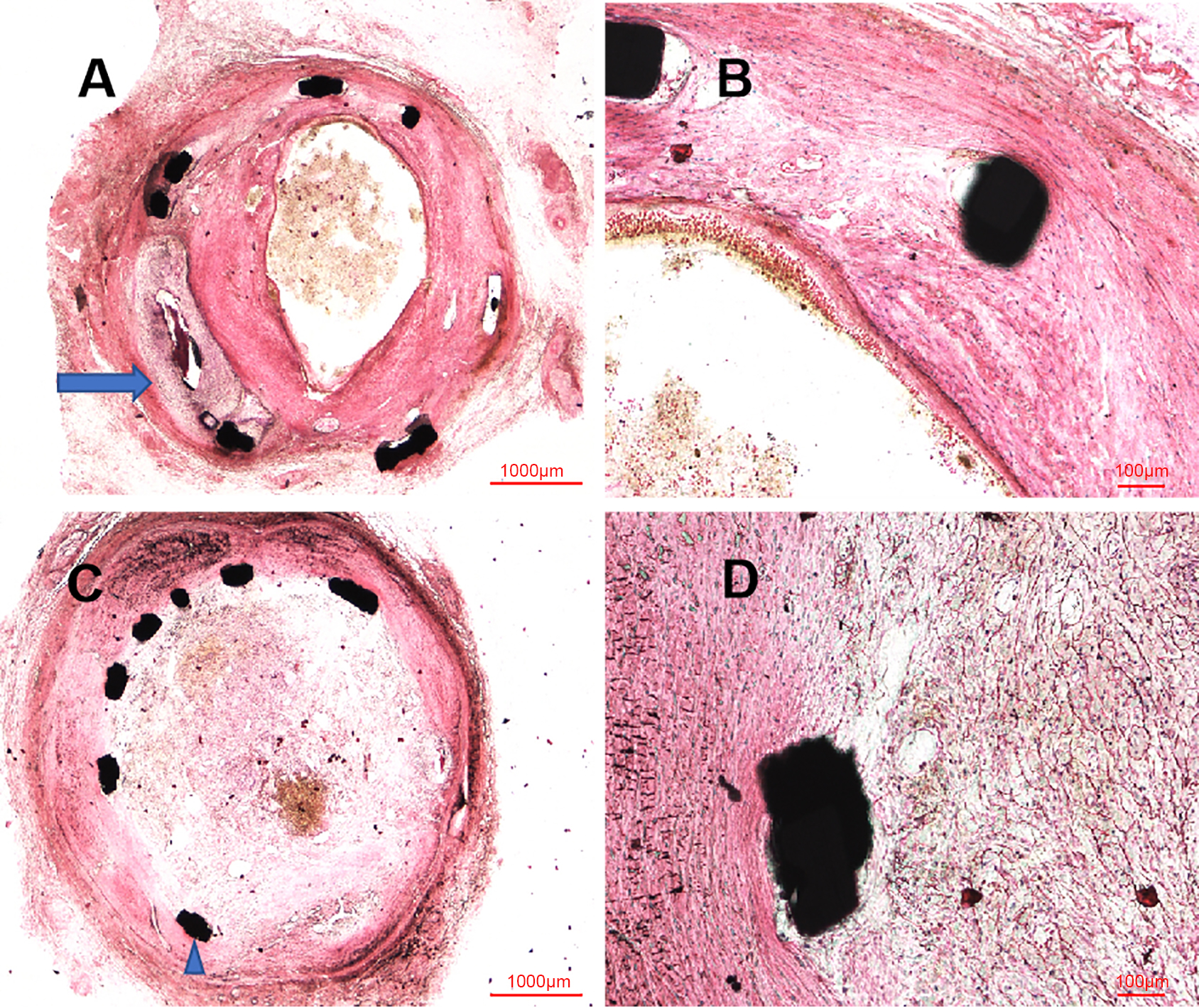 Similar to the OCT examination, histopathologic examination at six months showed the organized thrombosis with small plaques nourish vessels, blood clots and blood cells filling the vessel lumens, in the context of fibroplasia, smooth muscle proliferation and inflammatory cells near the stent structs, shown in Fig. 4. Moreover, the site of CAP induced by balloon burst was visualized in these histopathologic images. Nevertheless, the vessel lumens had been kept patent in the early time after procedure, shown in Fig. 5, with initial endothelization process of self-made covered stent and inflammatory cells along the identified PLLA membrane at 14 days (Fig. 5A,B), as well as fibroplasia, smooth muscle proliferation and inflammation response at 28 days (Fig. 5C,D).