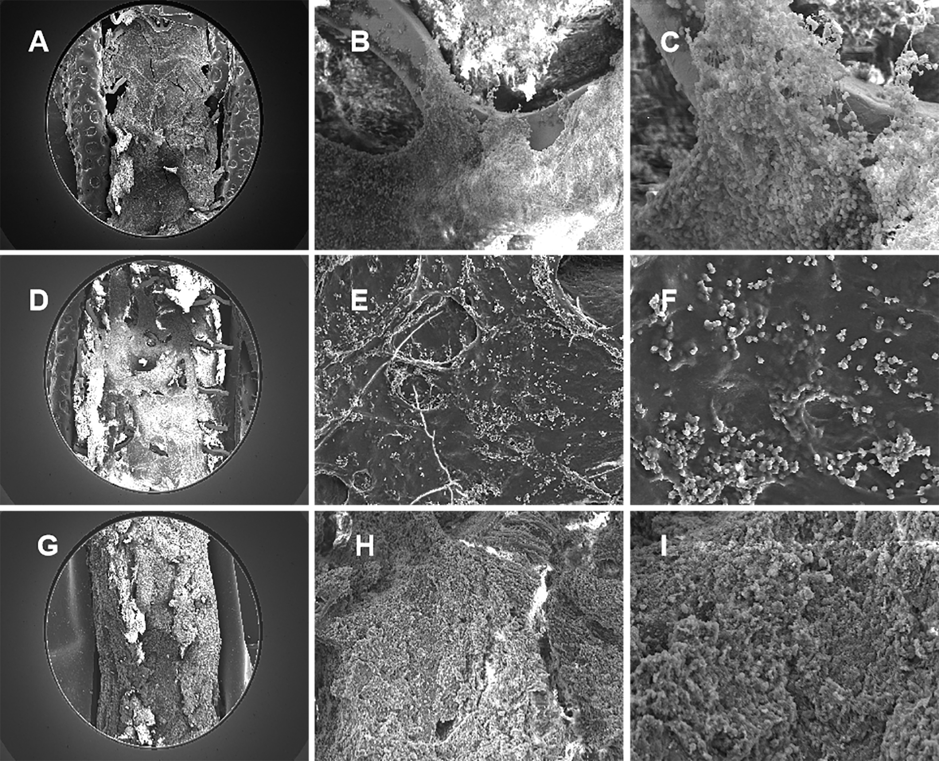 The serial SEM images was shown in Fig. 6, with gradual occlusion in RCA stented segment. Compared with the SEM images at 28 days shown in Fig. 6D–F, which was actively proliferation, with tight cell contact in the scaffold segment, the electron-microscopy at 14 days showed the endothelial cells inhomogeneously crawling on the scaffold structs, shown in Fig. 6A–C. Nevertheless, at six months, the fibrotic tissue and blood cells filled to full the vessel, shown in Fig. 6G–I, which rather differed from the electron-microscopies at 14 days and 28 days.