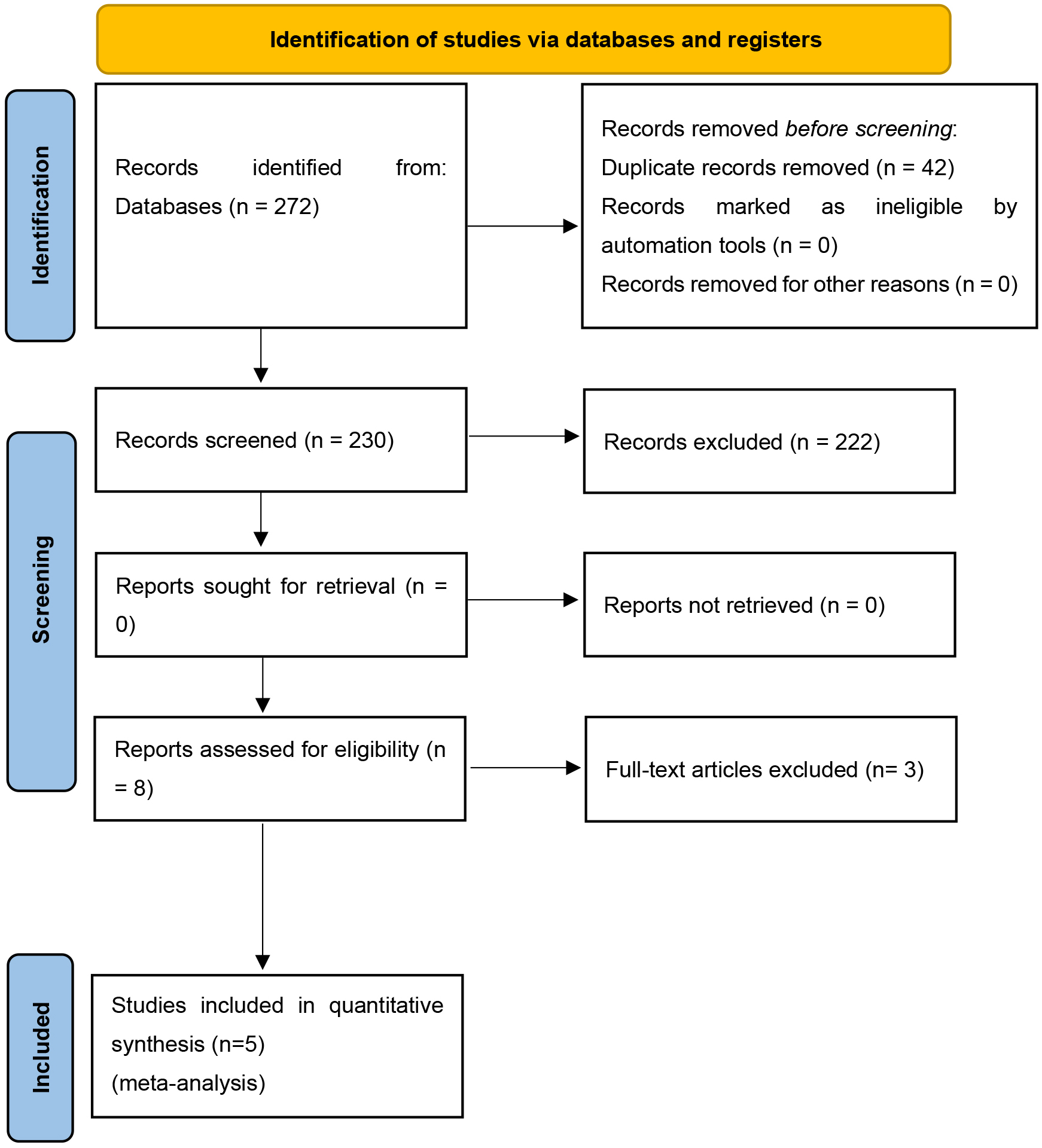We searched four databases and initially obtained 272 records that fit outlined search criteria. After removing duplicates, 230 records were identified (Fig. 1). Based on the titles and abstracts of these 230 articles, 222 records that did not meet our established inclusion criteria were excluded, and the remaining 8 articles underwent full-text review to judge suitability for study inclusion. Three of these eight articles were judged to not meet the inclusion criteria, resulting in five articles selected for inclusion in this meta-analysis [24, 25, 26, 27, 28]. Four of these five studies were case-control studies, also known as retrospective studies, and the other was a retrospective cohort study. A total of 9971 subjects were included in these studies, of which 3214 patients were diagnosed with CVD and the remaining 6757 subjects who received implant restoration had no diagnosis of CVD. These five studies provided prevalence data that could be synthesized by meta-analysis to investigate the relationship between CVD and peri-implantitis.