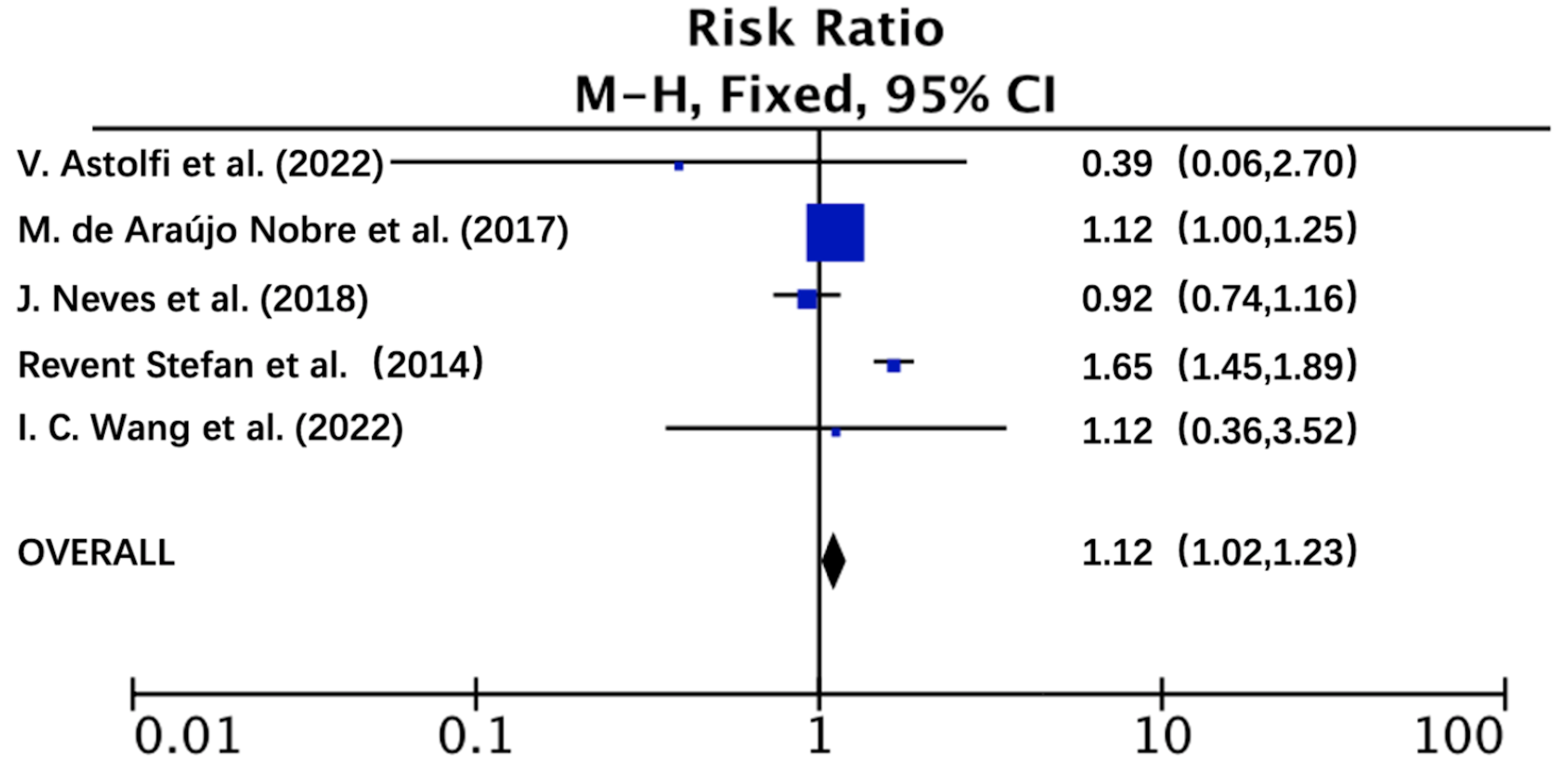Fig. 2.Forest Plot of the risk of peri-implantitis in cardiovascular diseases compared to non-cardiovascular diseases patients. RR, risk ratio; CI, Confidence interval; M-H, Mantel-Haenszel.