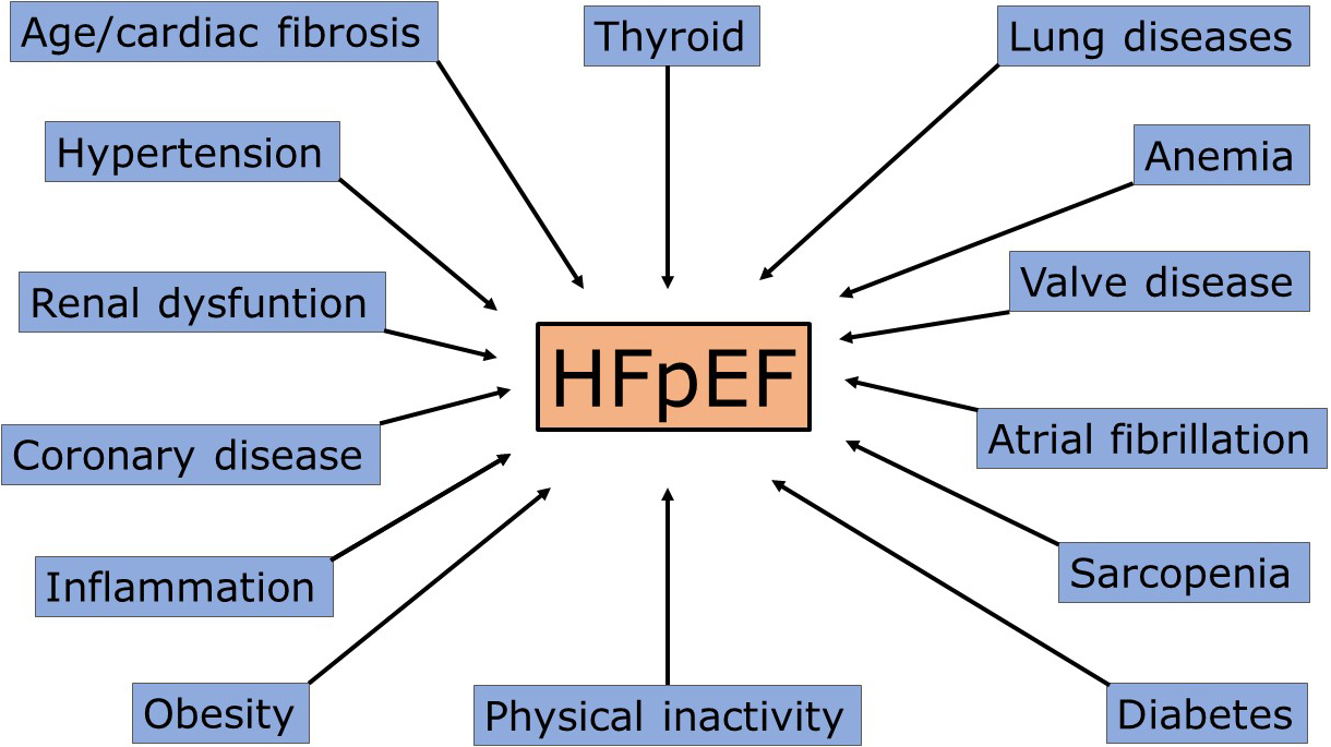 HFpEF is mainly a disease of ageing and is associated with widespread vascular, arterial, venous and cardiac stiffening and other co-morbidities. HFpEF is particularly common among the elderly population, because even when healthy and normal, older persons have substantial limitations in cardiovascular reserve, including cardiac output, heart rate, stroke volume, systolic and diastolic function, compared to younger subjects [46, 47, 48].