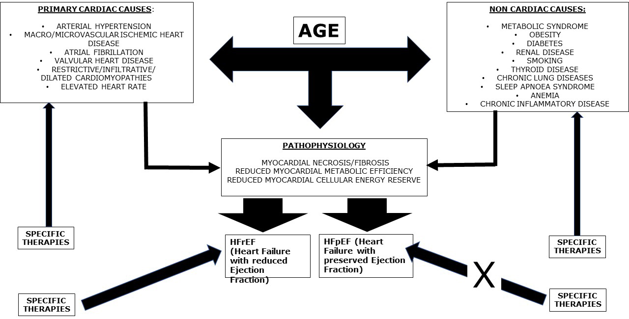The development of heart failure (HF) is due to primary cardiac causes which can, per se, directly determine HF with reduced ejection fraction (HFrEF), or eventually preliminarily pass through the condition of minimal myocardial damage, not determining significant left ventricular dysfunction and, therefore, entering in the classification of HF with preserved ejection fraction (HFpEF). Non cardiac causes alone generally determine HFpEF, which can eventually progress towards HFrEF, especially if associated to a cardiac cause: for example, a diabetic patient with an acute coronary syndrome. Age is a main regulator, for obvious reasons, playing a specific and mostly autonomous role in the development of HF. Whatever the cause of HF, age is a common aggravating factor. Age carries the condition of HF. Overall, specific therapies are aimed at preventing major cardiac causes of HF. They can also efficiently counteract all the additional promoting factors for heart failure, therefore reducing their impact in the pathogenesis of cardiac damage. Specific therapies are also effective in reducing the burden of HFrEF, while up to now they have been ineffective in reducing that of HFpEF, probably because the neurohormonal activation in the latter is not yet considerable.