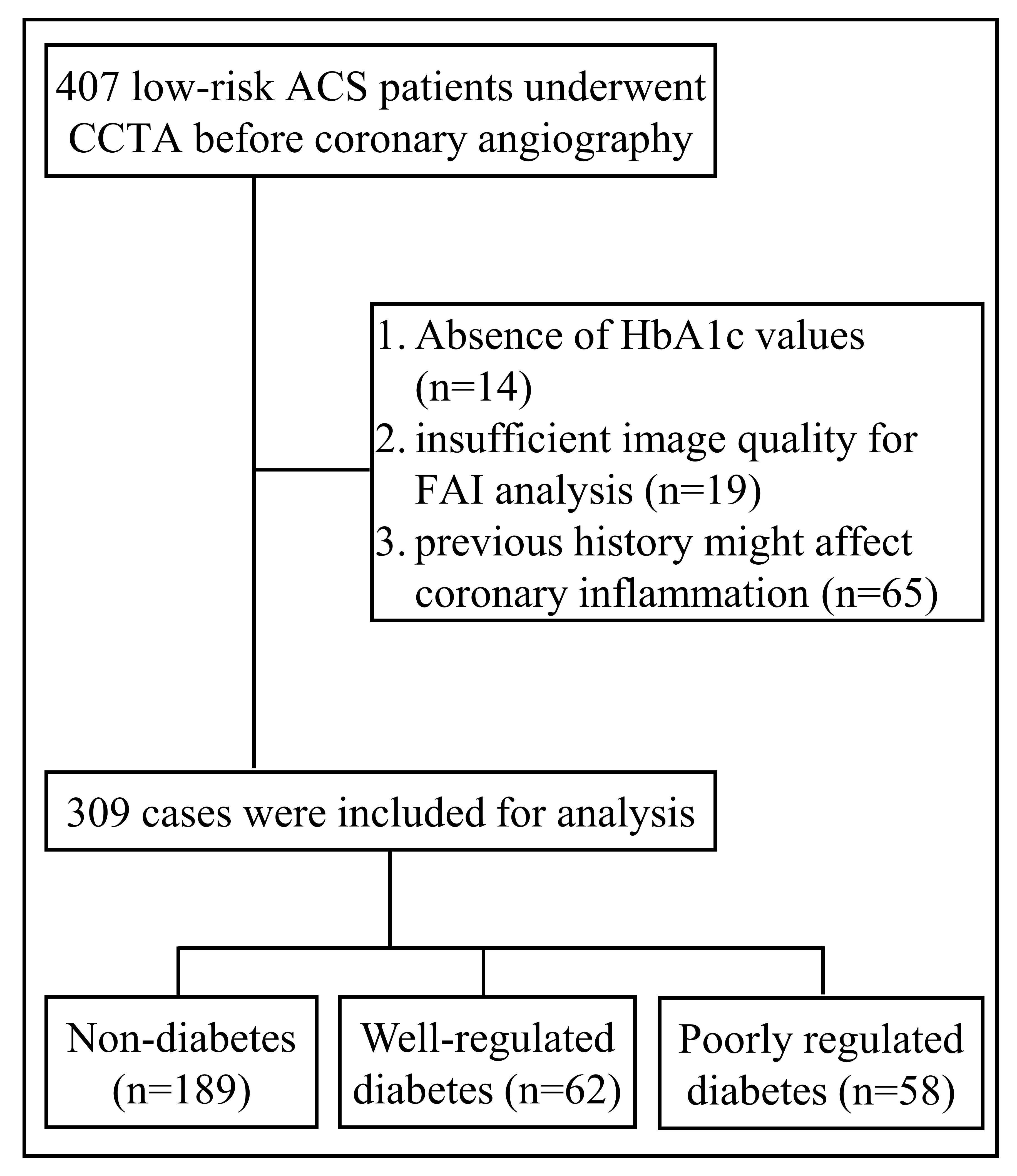 Fig. 1.Flow chart of study sample. ACS, acute coronary syndrome; CCTA, coronary computed tomography angiography; FAI, fat attenuation index; HbA1c, plasma glycated hemoglobin.