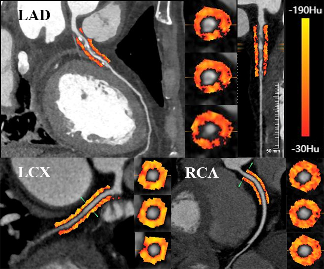 Fig. 3 shows the pericoronary FAI values around LAD, LCX, and RCA, among