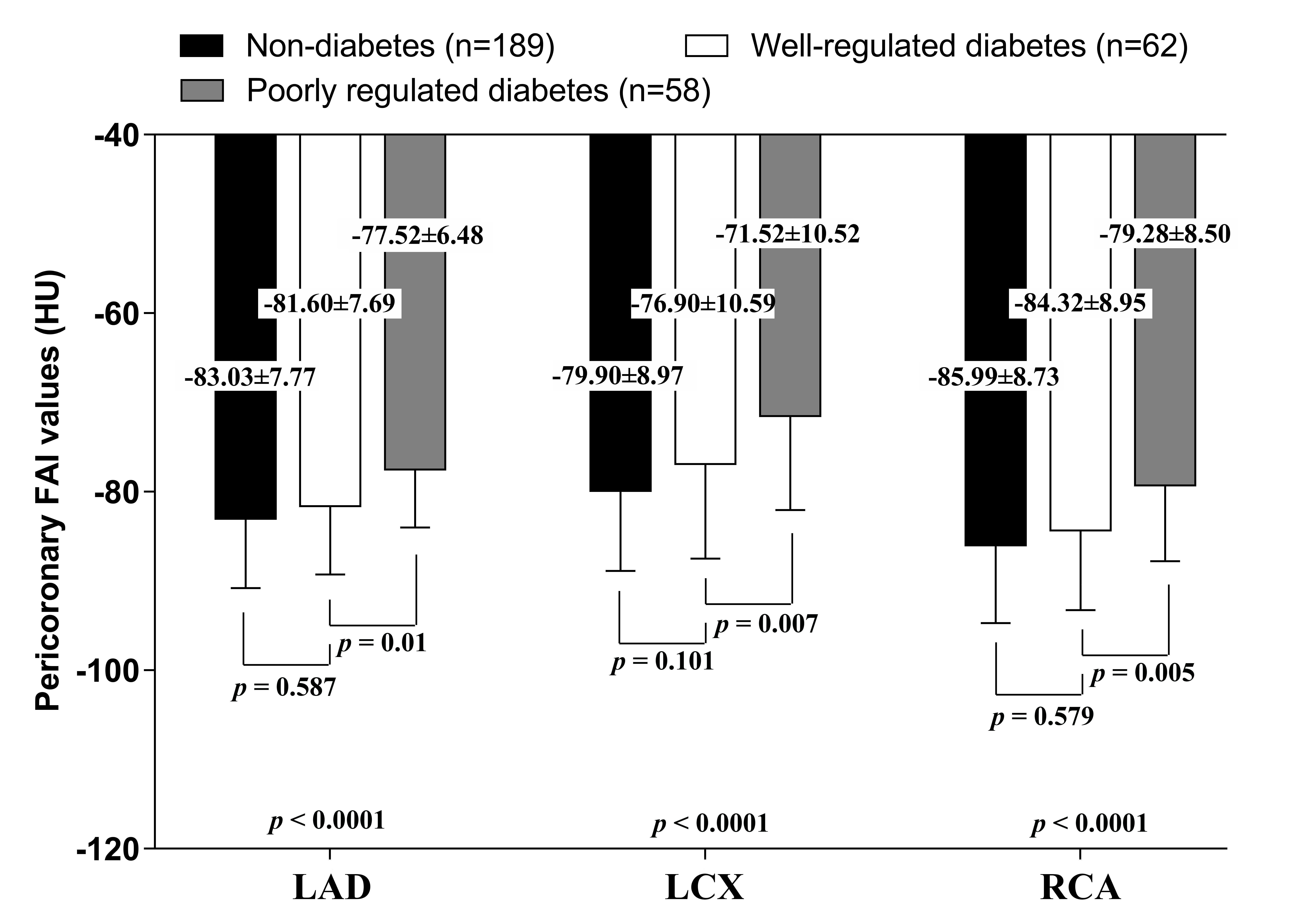 Fig. 3.FAI values around LAD, LCX, and RCA, among included participants by diabetes status. FAI, fat attenuation index; HU, Hounsfield unit; LAD, left anterior descending artery; LCX, left circumflex artery; RCA, right coronary artery.