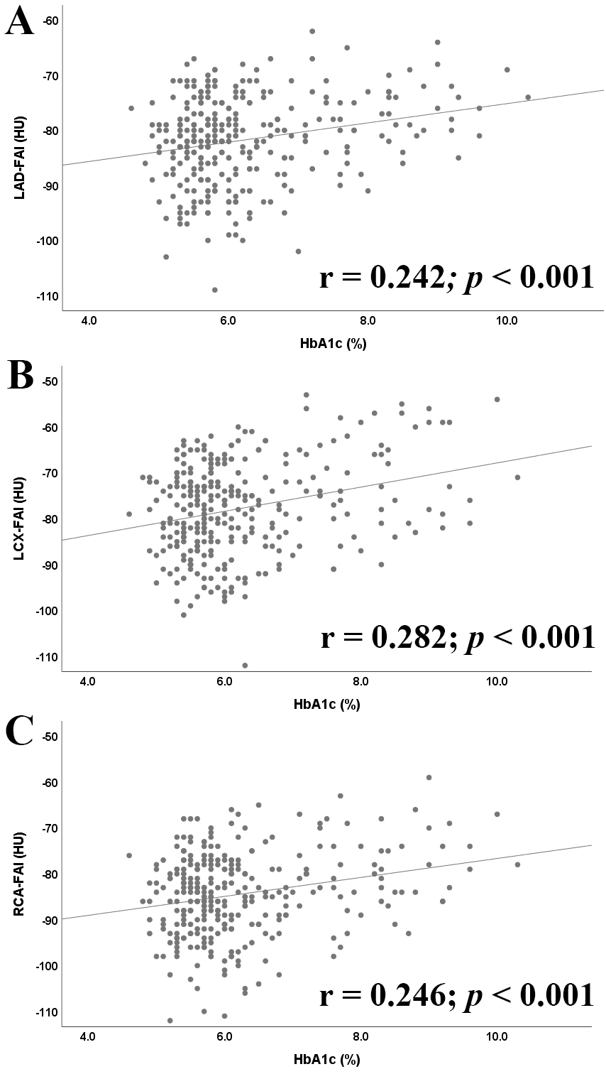 Fig. 4.Correlation between HbA1c Level and the FAI values around LAD (A), LCX (B), and RCA (C). FAI, fat attenuation index; HU, Hounsfield unit; LAD, left anterior descending artery; LCX, left circumflex artery; RCA, right coronary artery; HbA1c, plasma glycated hemoglobin.