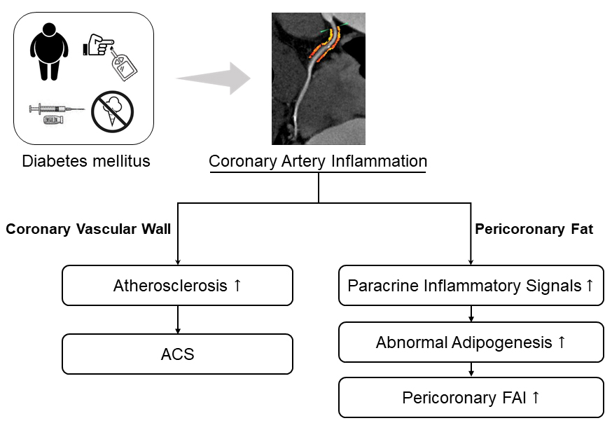 Vascular inflammation can be a cause of the significantly increased risk of CVD in diabetic patients [10, 11, 12]. Recent data have suggested that inflammation could cause metabolic defects in diabetes leading to endothelial injury and development of vascular complications [12]. Furthermore, chronic inflammation contributes to the development of coronary atherosclerosis and is one of the features of vulnerable coronary plaques [13]. Until recently, inflammation-assessment tools could not effectively evaluate coronary local inflammation. For example, systemic plasma biomarkers such as high sensitivity C-response protein (hsCRP) and pro-inflammatory cytokines are not directly related to the process of atherogenesis. Positron emission tomography (PET) imaging, as the gold standard in evaluating perivascular adipose tissue (PVAT) inflammation [14], is limited by its high cost, high exposure, and low clinical availability. Therefore, finding an accessible clinical detection method that reflects the current status of vascular inflammation is very important for the early diagnosis of cardiovascular complications. Fortunately, pericoronary fat attenuation index (FAI), derived from coronary computed tomography angiography (CCTA), has emerged as a novel imaging biomarker that overcomes these limitations and noninvasively detects coronary artery local inflammation. During active vessel inflammation, the paracrine inflammatory signals secreted by vascular walls would diffuse to PVAT and prevent local adipogenesis by affecting biological processes such as adipocyte proliferation, differentiation, and lipolysis. These lead to a change of composition of PVAT around inflamed arteries. This change could be captured by CCTA and presented as an attenuation that shifts from the lipid phase (more negative Hounsfield units [HU] values) to the aqueous phase (less negative HU values), known as the pericoronary FAI [15]. Our previous study demonstrated that pericoronary FAI is a useful imaging biomarker that helps identify vulnerable plaque characteristics [16]. Furthermore, a recent meta-analysis elucidated the role of pericoronary FAI in discriminating between stable and unstable plaques, adding information to the prognosis for future major adverse cardiovascular events (MACE) [17]. However, the previous study did not focus on the effect of glycemic control on pericoronary FAI, which is also of clinical importance in monitoring coronary inflammation progression and preventing CVD development.